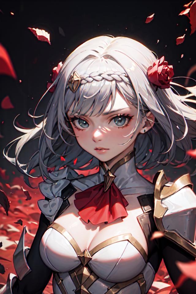 1girl, armor, ascot, bangs, blue eyes, braid, cleavage, earrings, flower, green eyes, grey hair, hair flower, hair ornament, jewelry, looking at viewer, medium breasts, medium hair, parted lips, petals, red ascot, red flower, red rose, rose, rose petals , short hair, shoulder armor, solo, upper body, white hair