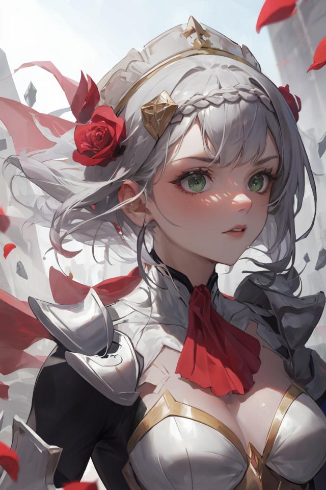 a women with long white hair and a red rose in her hair and wearing a crown and a large red ribbon on top of her head