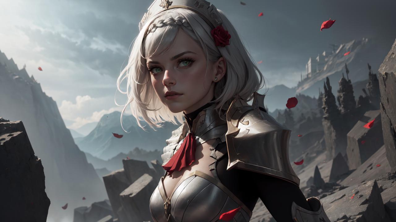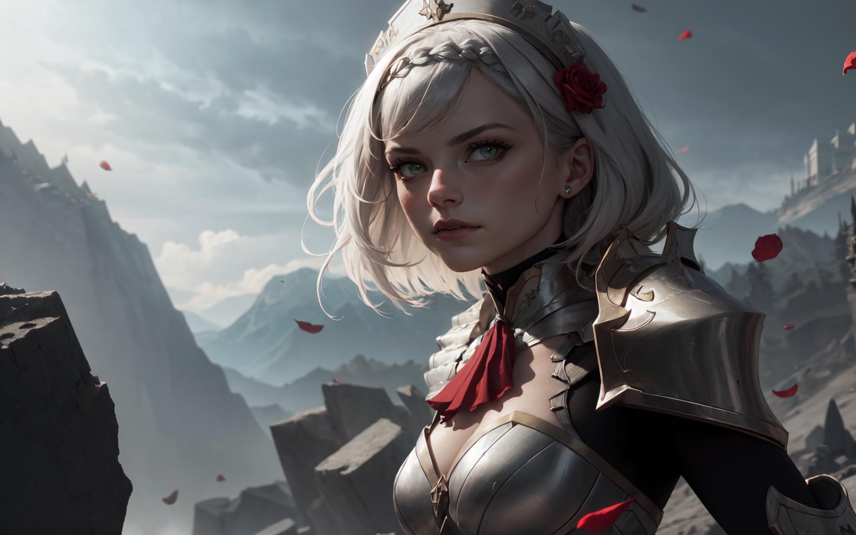1girl, armor, ascot, bangs, braid, braided bangs , breastplate, cleavage, cloud, earrings, flower, green eyes, hair flower, hair ornament, jewelry, looking at viewer, maid, maid headdress, medium breasts, mountain, outdoors, pauldrons, petals, realistic, red ascot, red flower, red rose, rose, short hair, shoulder armor, sky, solo, upper body, white hair, wind