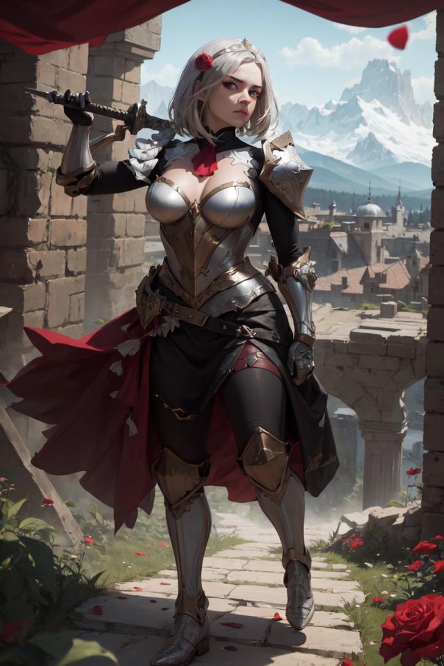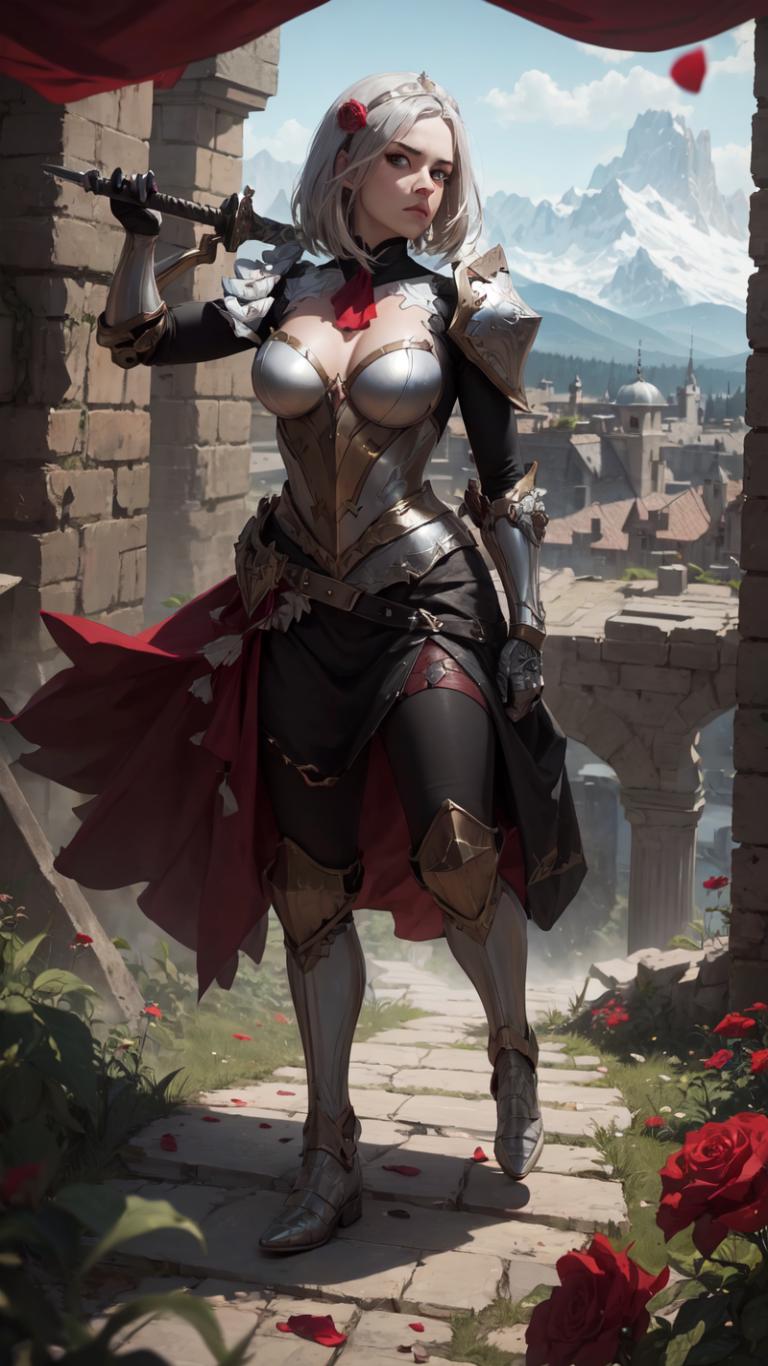 1girl, armor, armored boots, armored dress, ascot, boots, braid, cleavage, clothing cutout, day, flower, full body, gauntlets, hair flower, hair ornament, holding, holding sword, holding weapon, looking to the side, medium breasts, outdoors, pauldrons, petals, red flower, red rose, rose, rose petals , short hair, shoulder armor, sky, solo, standing, sword, weapon, white hair