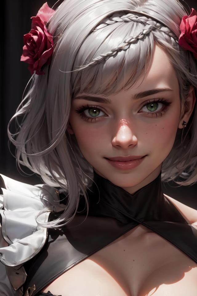1girl, bangs, braid, cleavage, cleavage cutout, closed mouth, clothing cutout, earrings, eyelashes, flower, freckles, green eyes, grey hair, hair flower, hair ornament, jewelry, looking at viewer, maid, maid headdress, medium breasts, mole, mole on breast, nose , portrait, realistic, red flower, rose, short hair, smile, solo, upper body