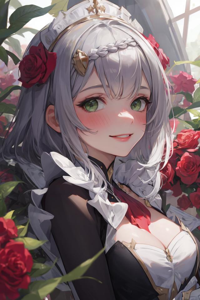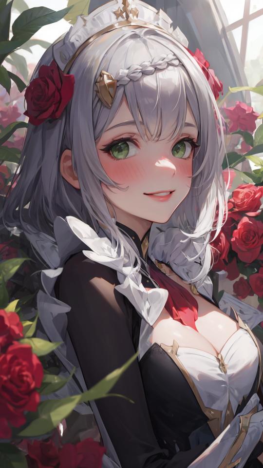 a woman looking over another lady's shoulder to the side with a rose behind her head, surrounded by roses and foliage the sun