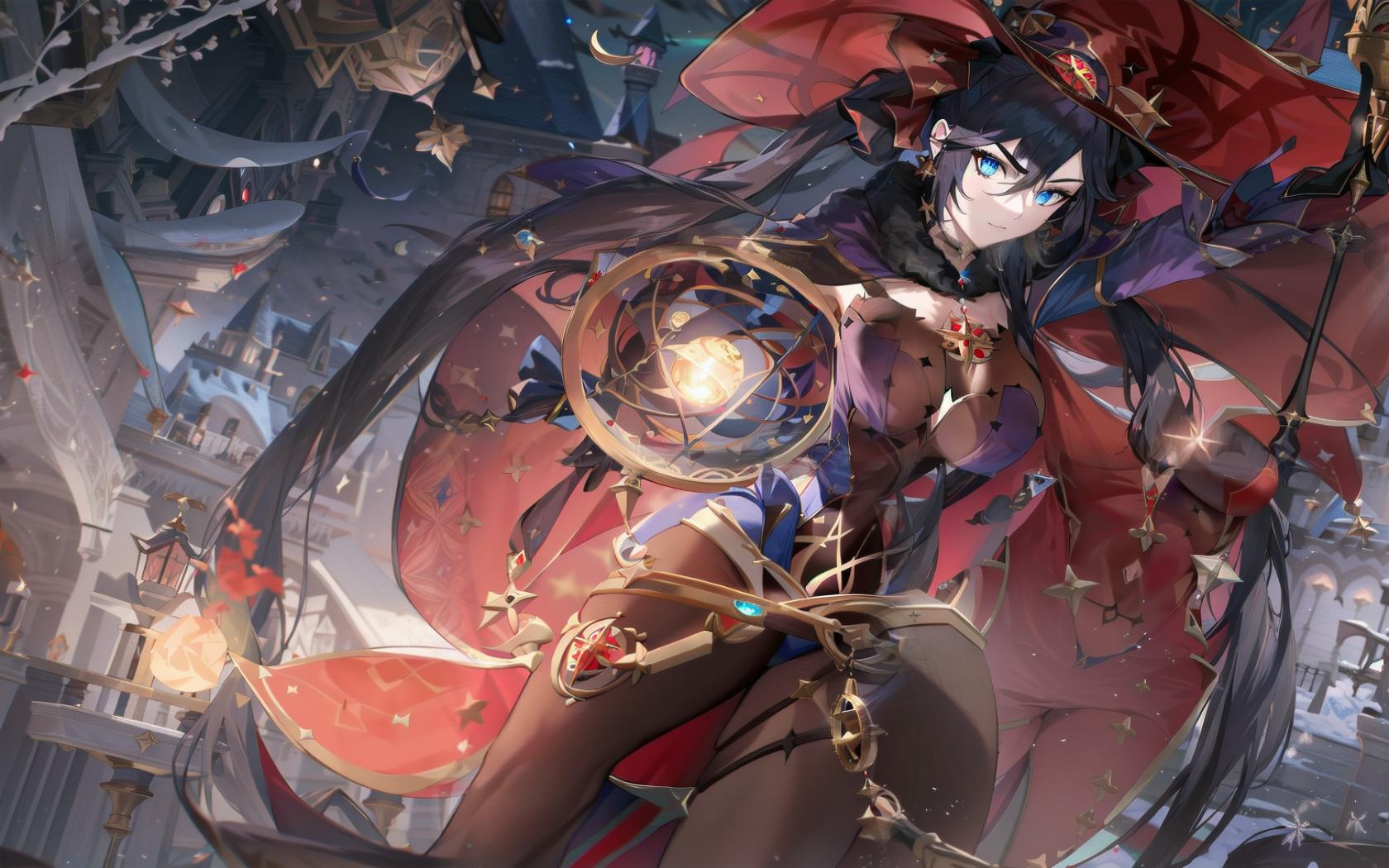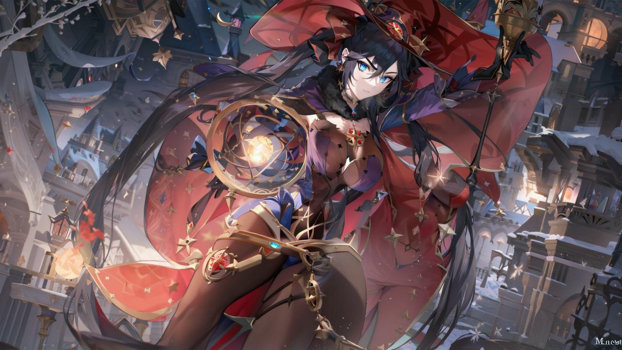 1girl, bangs, black gloves, black hair, black pantyhose, blue eyes, blue leotard, bodystocking, cape, choker, closed mouth, covered navel, detached sleeves, earrings, fur collar, gloves, gold trim, hair between eyes, hat, hat ornament, highleg, highleg leotard, holding, jewelry, leotard, long hair, looking at viewer, magic, medium breasts, pantyhose, solo, star (symbol), star earrings , thighlet, twintails, very long hair, witch hat