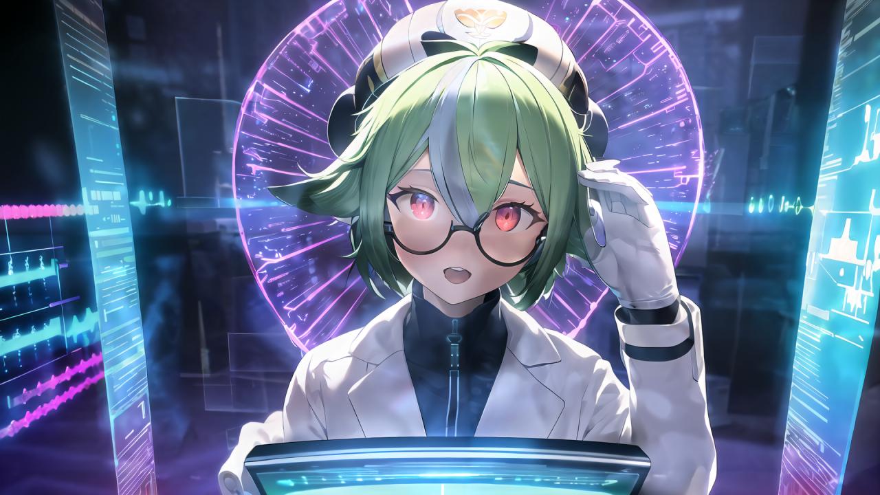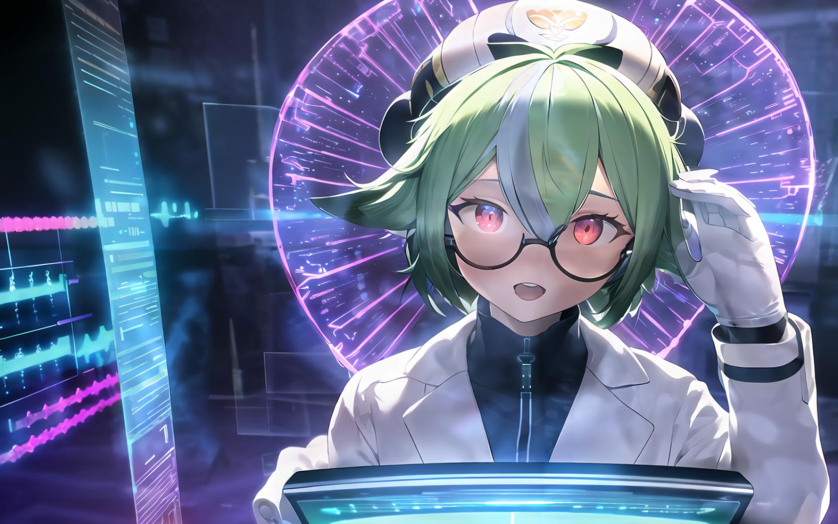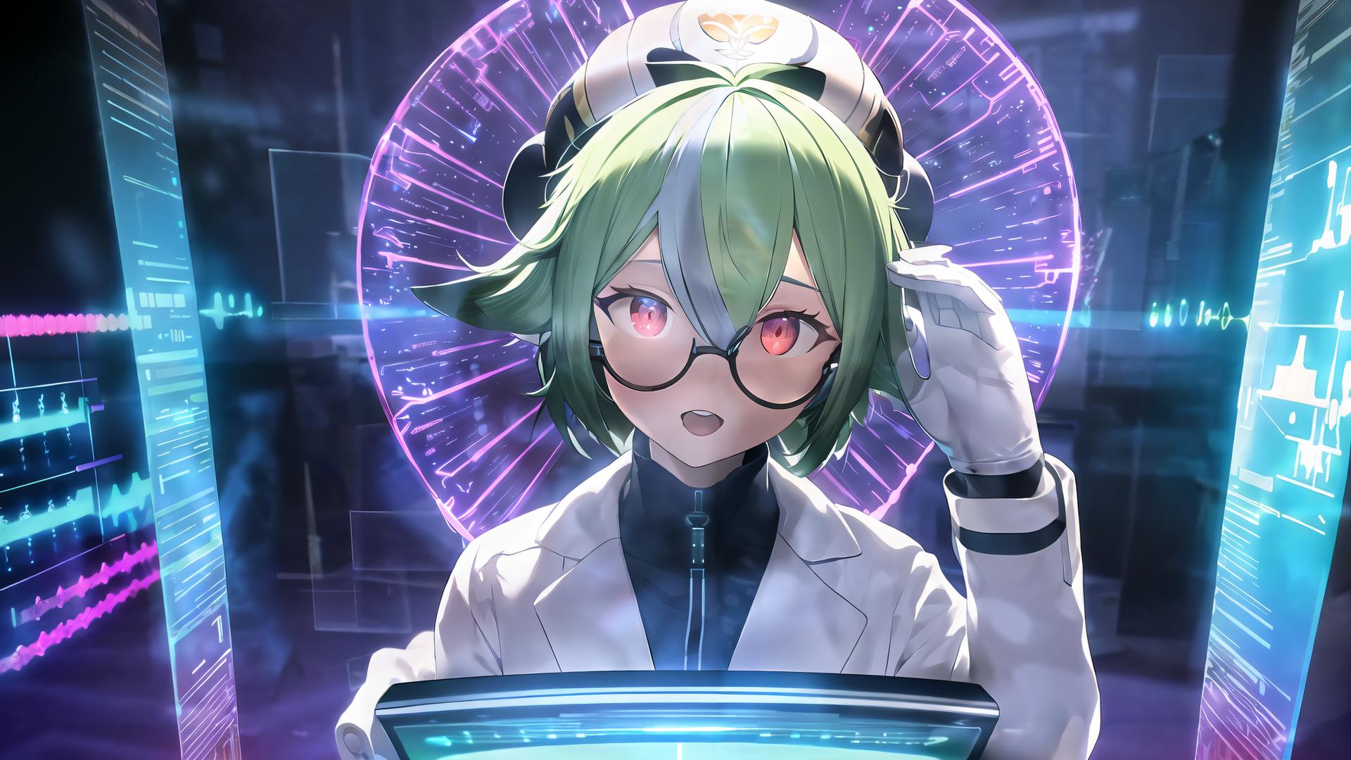 1girl, :d, alternate costume, animal ears, bangs, black-framed eyewear, blush, glasses, gloves, green hair, hair between eyes, hand up, hat, holding, holding clipboard , labcoat, long sleeves, looking at viewer, multicolored hair, open mouth, red eyes, round eyewear, short hair, smile, solo, upper body, upper teeth only, white gloves, white headwear
