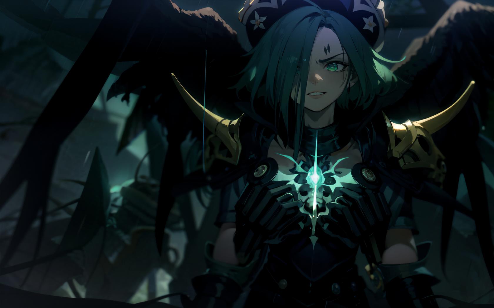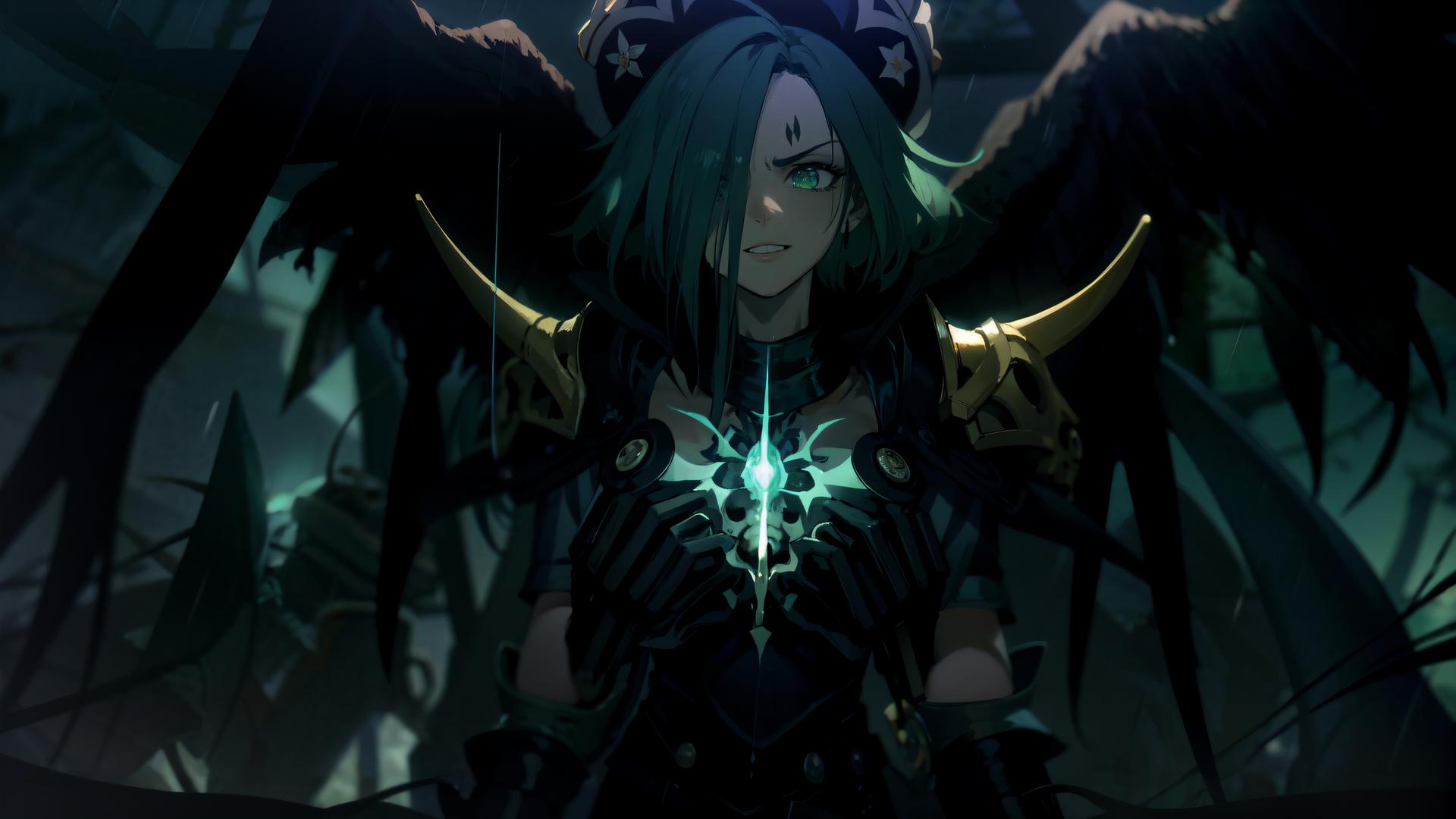 a girl with green hair and black eye makeup holding a glowing cross piece standing in the air by her neck wings and head pieces behind her