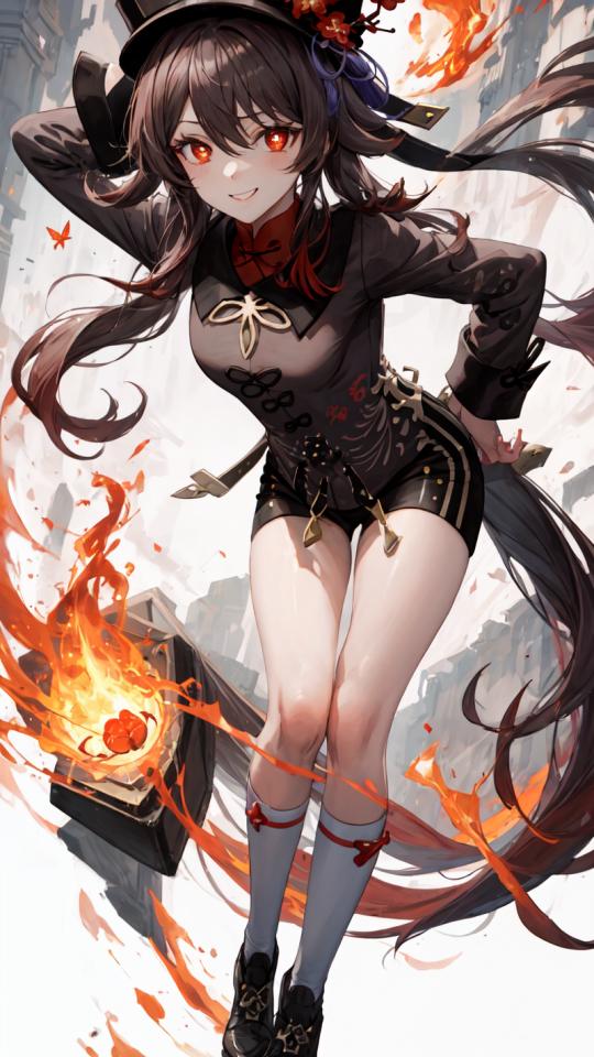 1girl, arm behind head, arm up, bangs, black footwear, black headwear, black nails, black shorts, blush, brown hair, butterfly, fire, floating hair, flower, flower-shaped pupils, full body, grin, hair between eyes, hand on hip, hat, hat flower, jewelry, kneehighs, long hair, long sleeves, looking at viewer, nail polish, plum blossoms, porkpie hat , red eyes, red flower, shirt, shoes, short shorts, shorts, small breasts, smile, socks, solo, standing, symbol-shaped pupils, tailcoat, twintails, very long hair, white socks