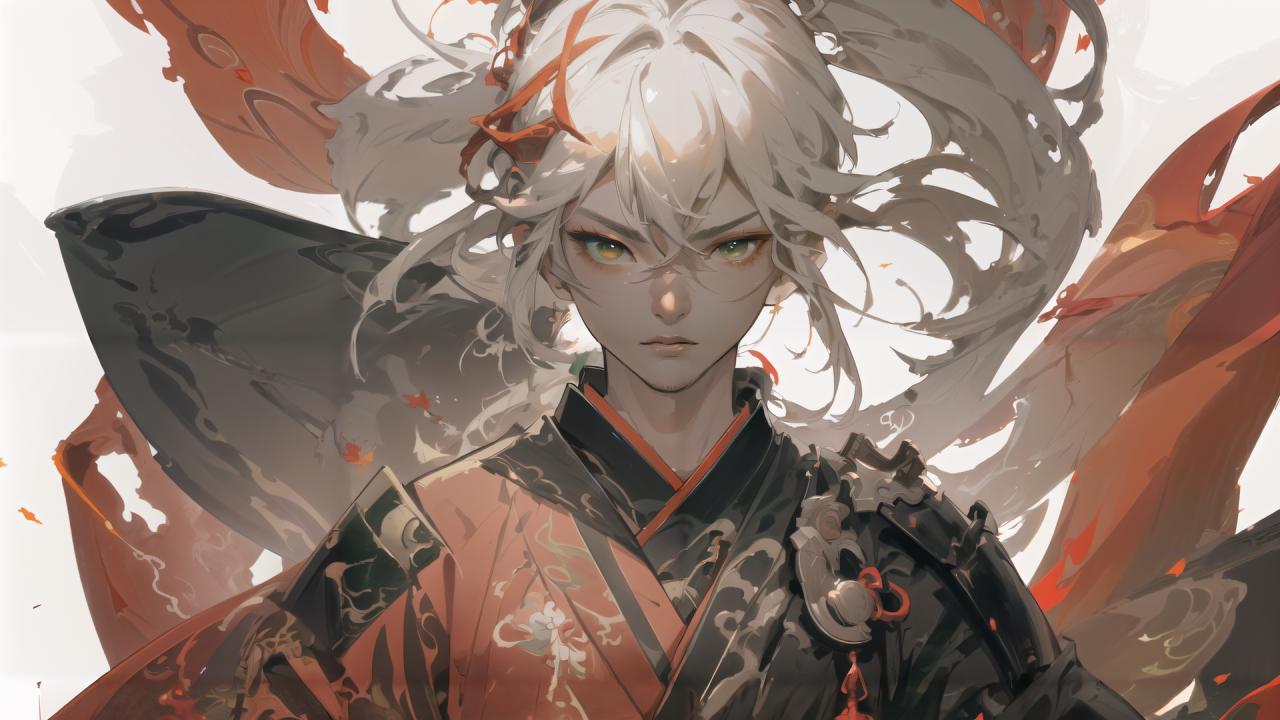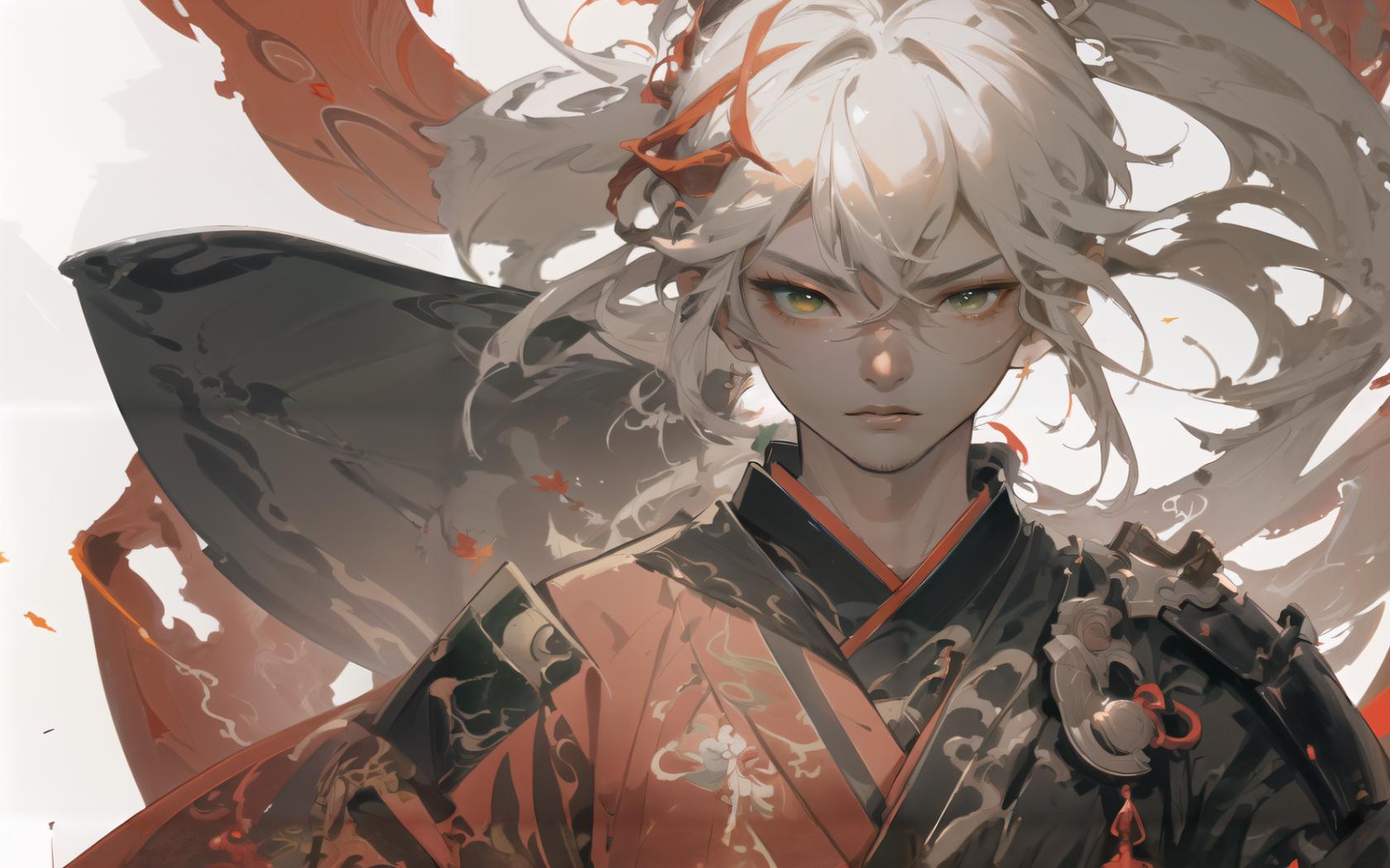 1boy, armor, bangs, closed mouth, crossed bangs, hair between eyes, japanese armor , japanese clothes, kimono, looking at viewer, male focus, multicolored hair, ponytail, red hair, shoulder armor, simple background, solo, streaked hair, upper body, white background, white hair, yellow eyes