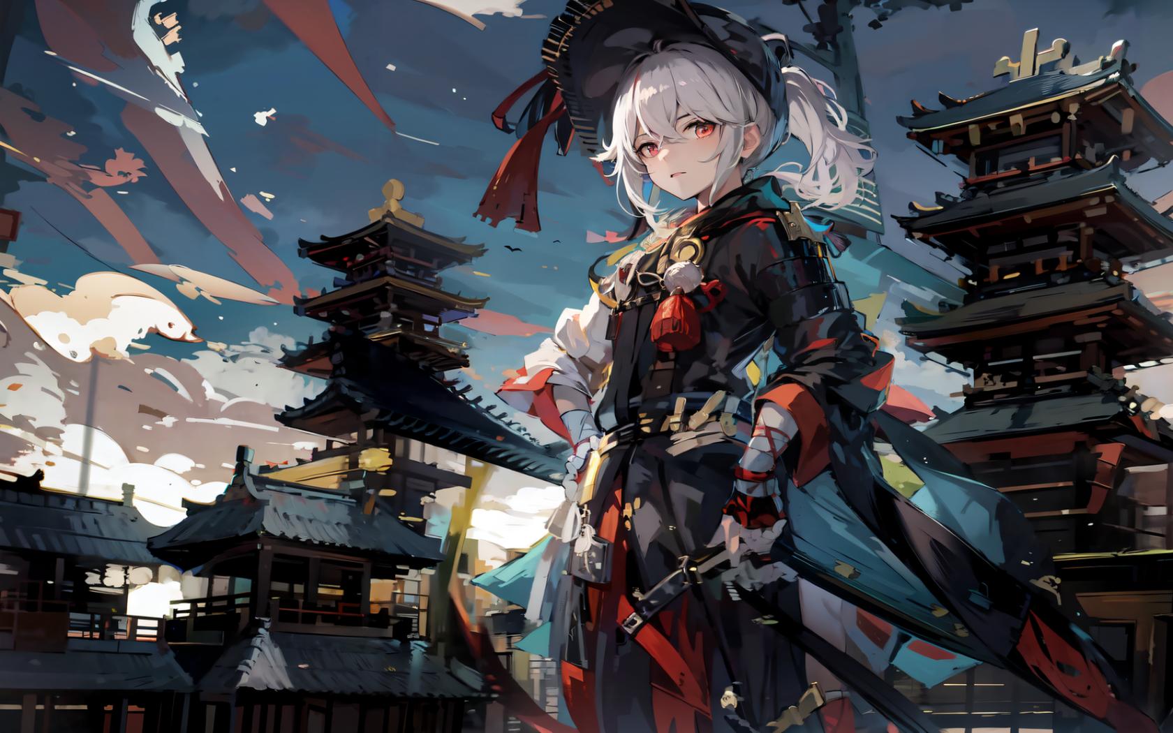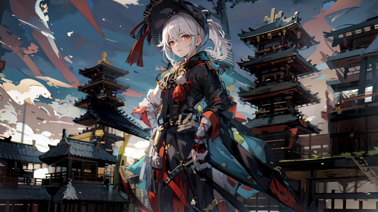 1boy, architecture, armor, bandaged arm, bandaged hand , bandages, bangs, closed mouth, cloud, crossed bangs, east asian architecture, fingerless gloves, gloves, hair between eyes, hand on hip, hat, holding, holding sword, holding weapon, japanese armor, japanese clothes, looking at viewer, male focus, multicolored hair, outdoors, parted lips, ponytail, red eyes, red hair, sheath, sheathed, sky, solo, standing, streaked hair, sword, tassel, weapon, white hair