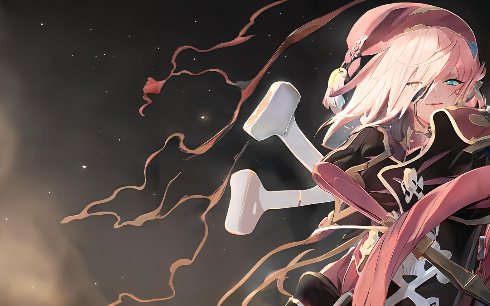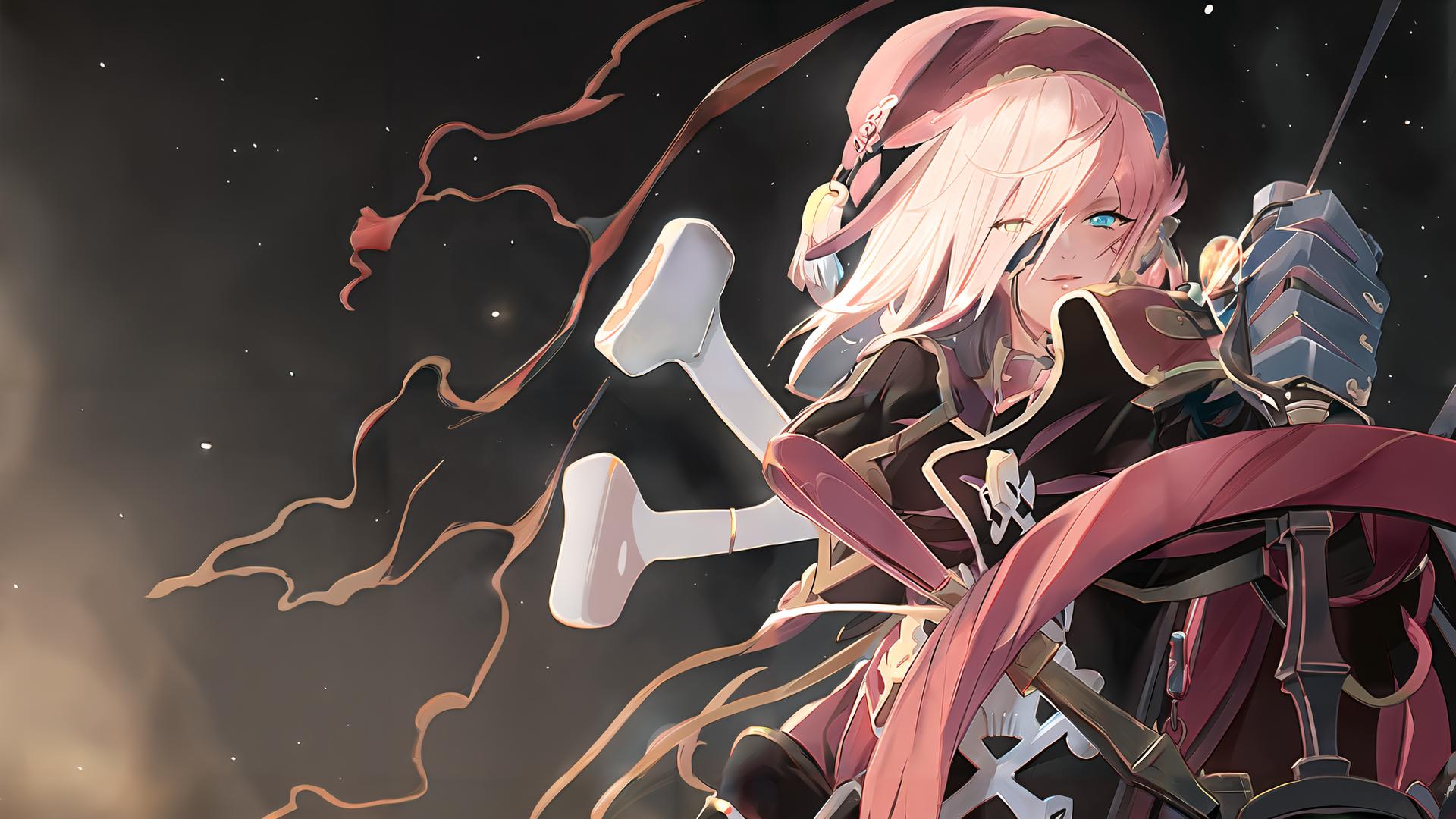 the image of an anime character with a sword in her hand at nighty skies, one of which is waving through the air and behind them