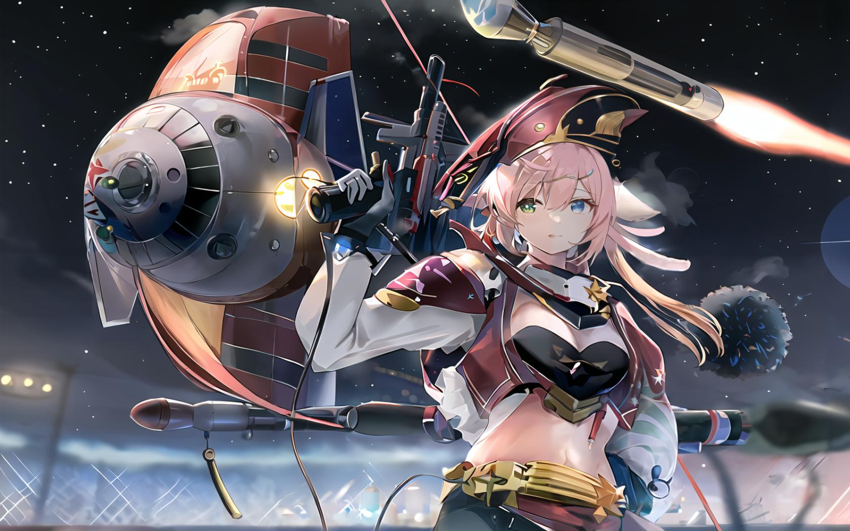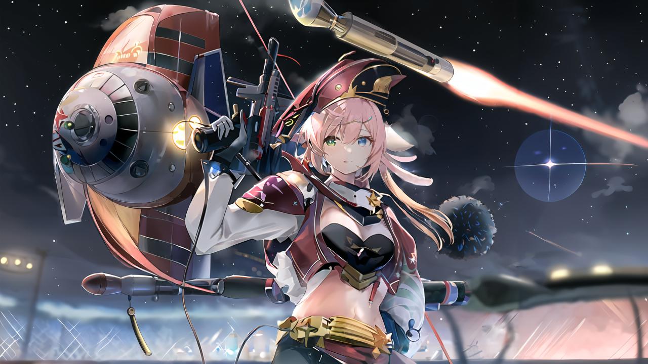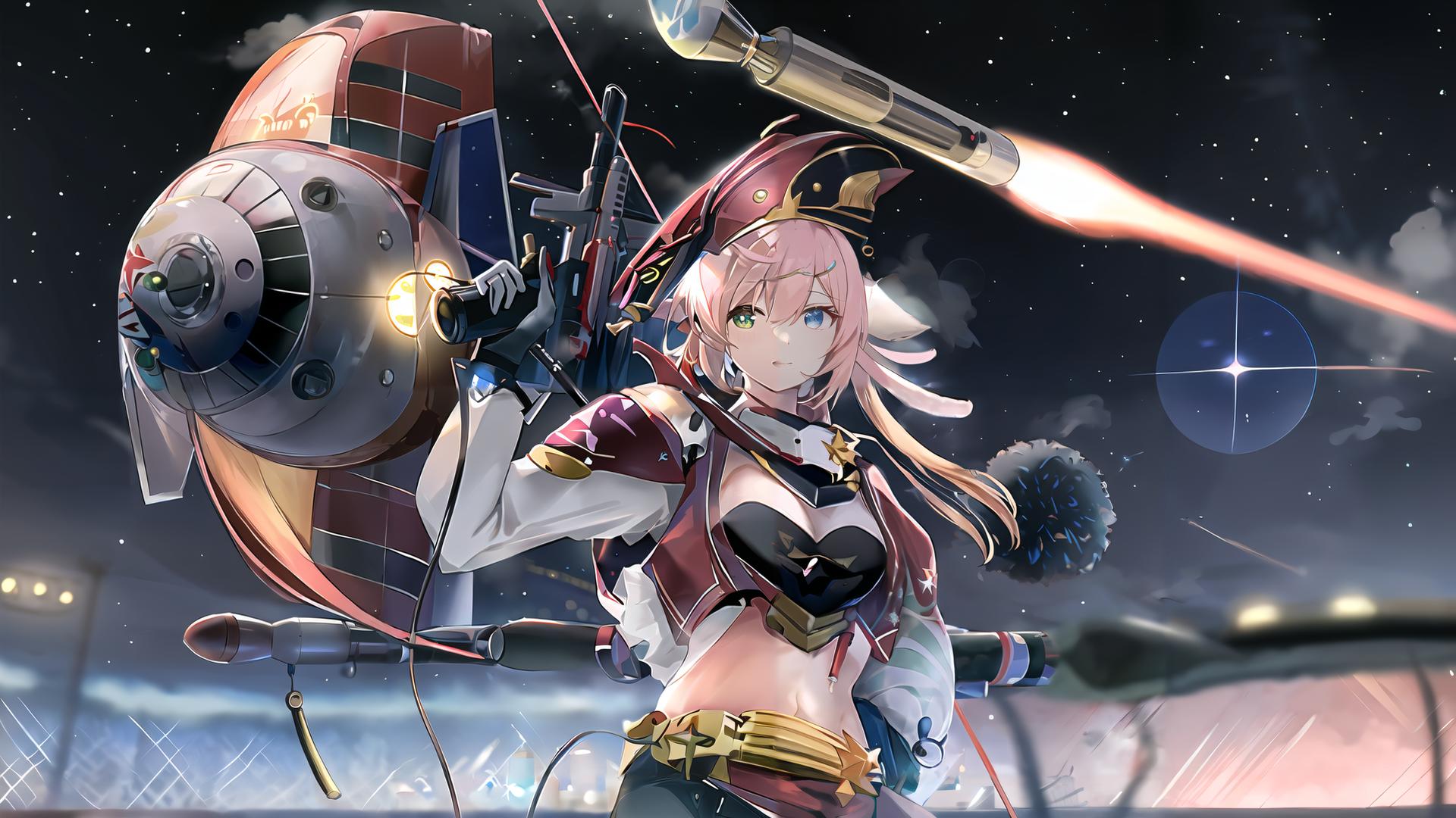 1girl, antlers, bangs, bare shoulders, cleavage, cleavage cutout, clothing cutout, cloud, crop top, detached sleeves, gloves, green eyes, gun, hair between eyes, hat, holding, holding gun, holding weapon, horns, long hair, long sleeves, looking at viewer, medium breasts, midriff, navel, night, night sky, outdoors, pink hair, red headwear, rifle, shooting star , sky, smile, solo, star (sky), starry sky, stomach, weapon