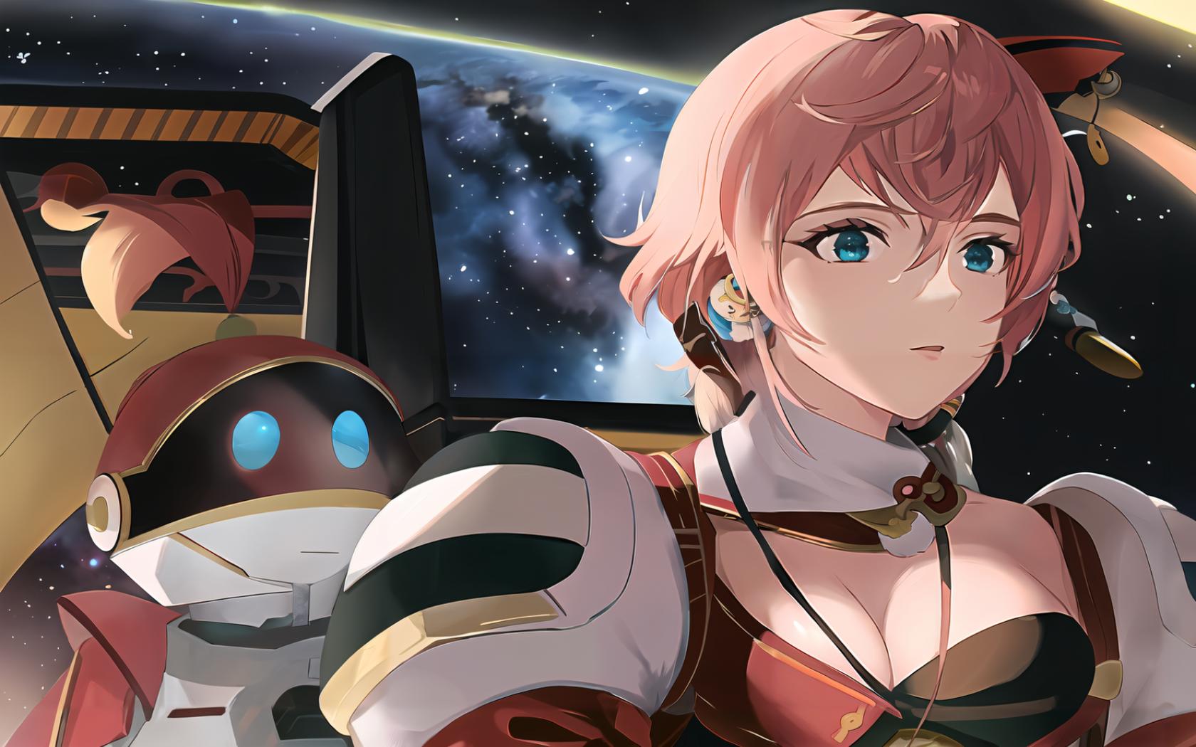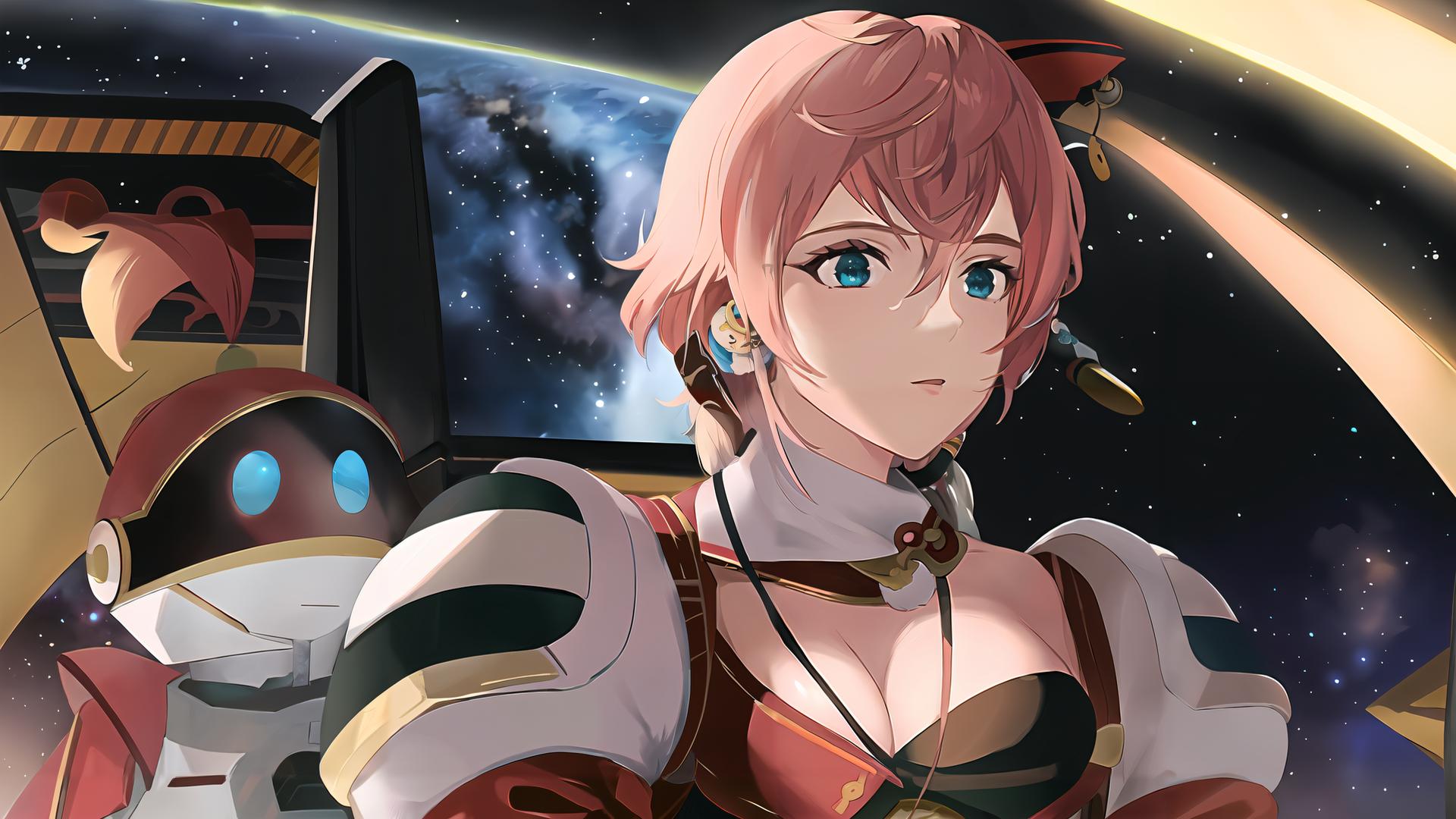 a anime woman is holding her camera by someone and the space in the background looks far too creepy in person's face, her left eye is bright blue with a big yellow