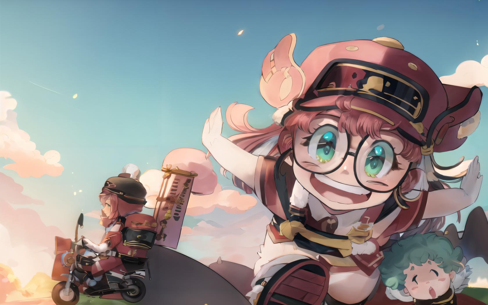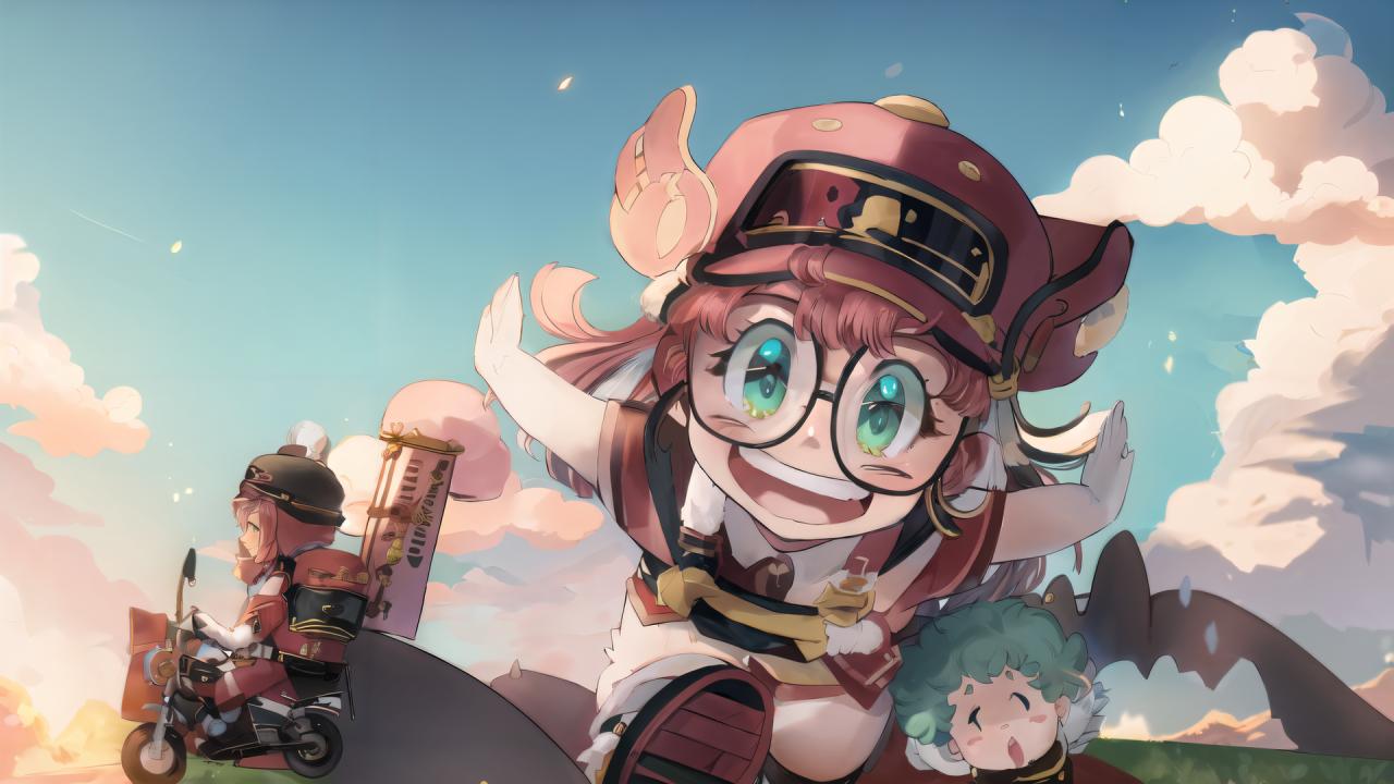 some anime style characters are holding guns in front of a mountain and the sky above them is blue and cloudy, there are two people