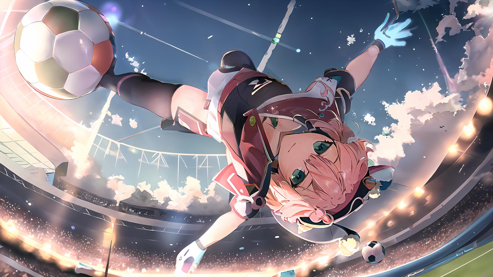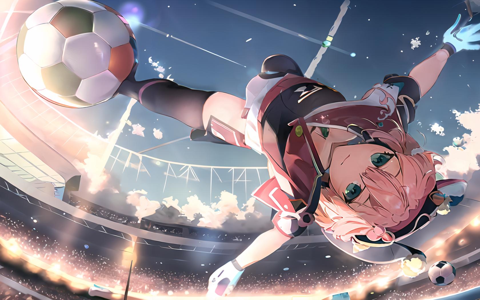 a female soccer player in the air near an outdoor stadium soccer field and audience in the stands with ball on leg and balls falling off