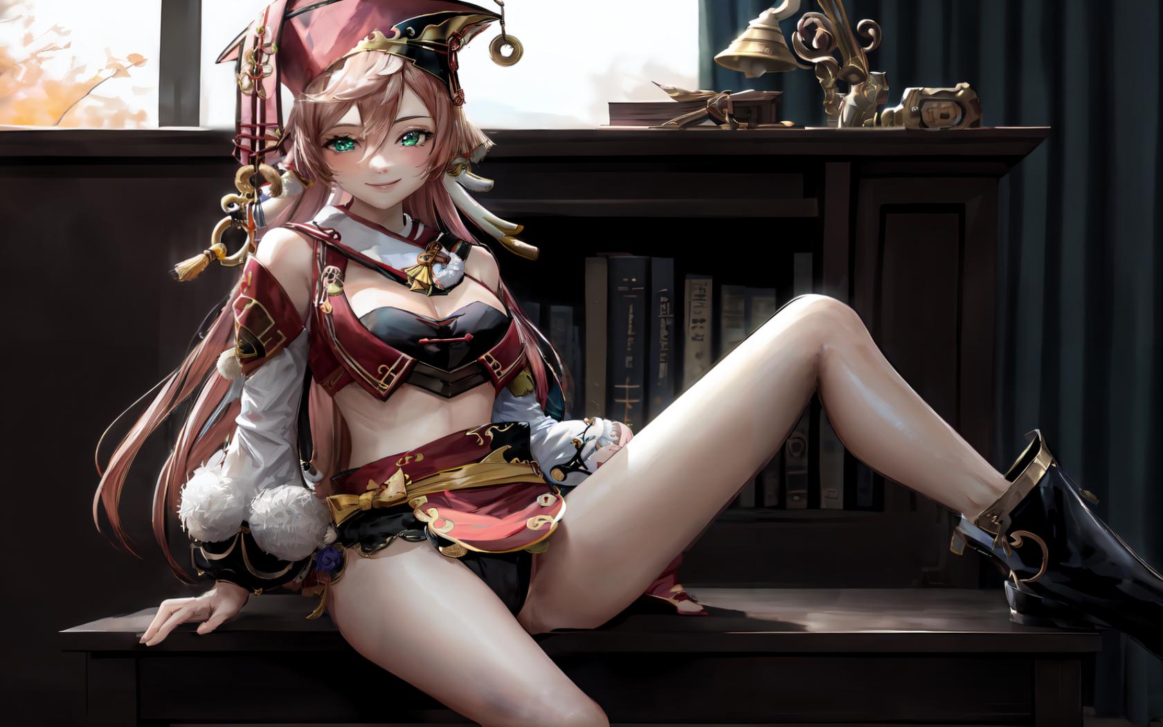 1girl, antlers, arm support, bangs, bare legs, bare shoulders, black bra, black footwear, black panties, blush, book, boots, bra, cleavage, cleavage cutout, clothing cutout, crop top, curtains, desk, detached sleeves, green eyes, hair between eyes, hat, high heels, horns, indoors, knee up, legs, long hair, long sleeves, looking at viewer, medium breasts, midriff, on desk, panties, pink hair, red headwear, red skirt, sitting, sitting on desk , skirt, small breasts, smile, solo, stomach, underwear, very long hair, white sleeves, window