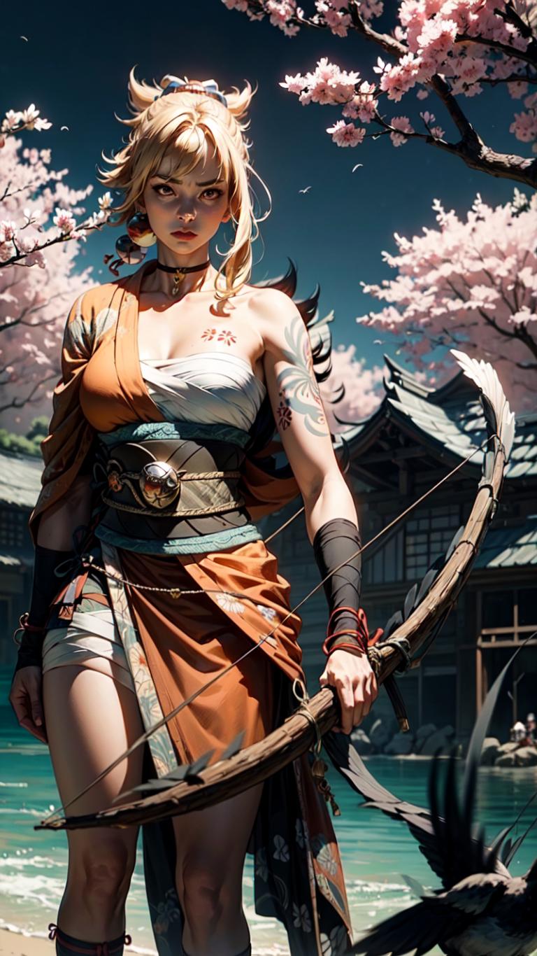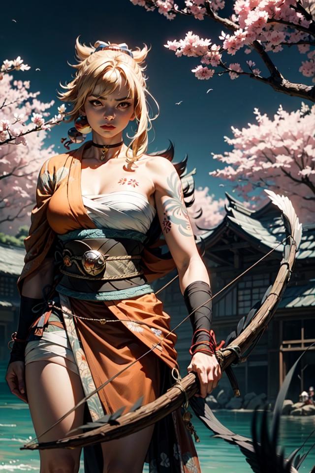 1girl, architecture, arm tattoo, bandaged arm, bandaged leg, bandages, bangs, bare shoulders, bird, blonde hair, bow (weapon), bracelet, cherry blossoms, chest sarashi, chest tattoo, choker, cleavage, closed mouth, collarbone, day, east asian architecture, feet out of frame, hadanugi dousa, hair ornament, holding, holding bow (weapon), holding weapon, japanese clothes, jewelry, kimono, kneehighs, looking at viewer, medium breasts, obi, orange kimono , outdoors, ponytail, rope, sarashi, sash, shimenawa, single bare shoulder, single glove, sky, solo, standing, tattoo, tree, vision (genshin impact), water, weapon