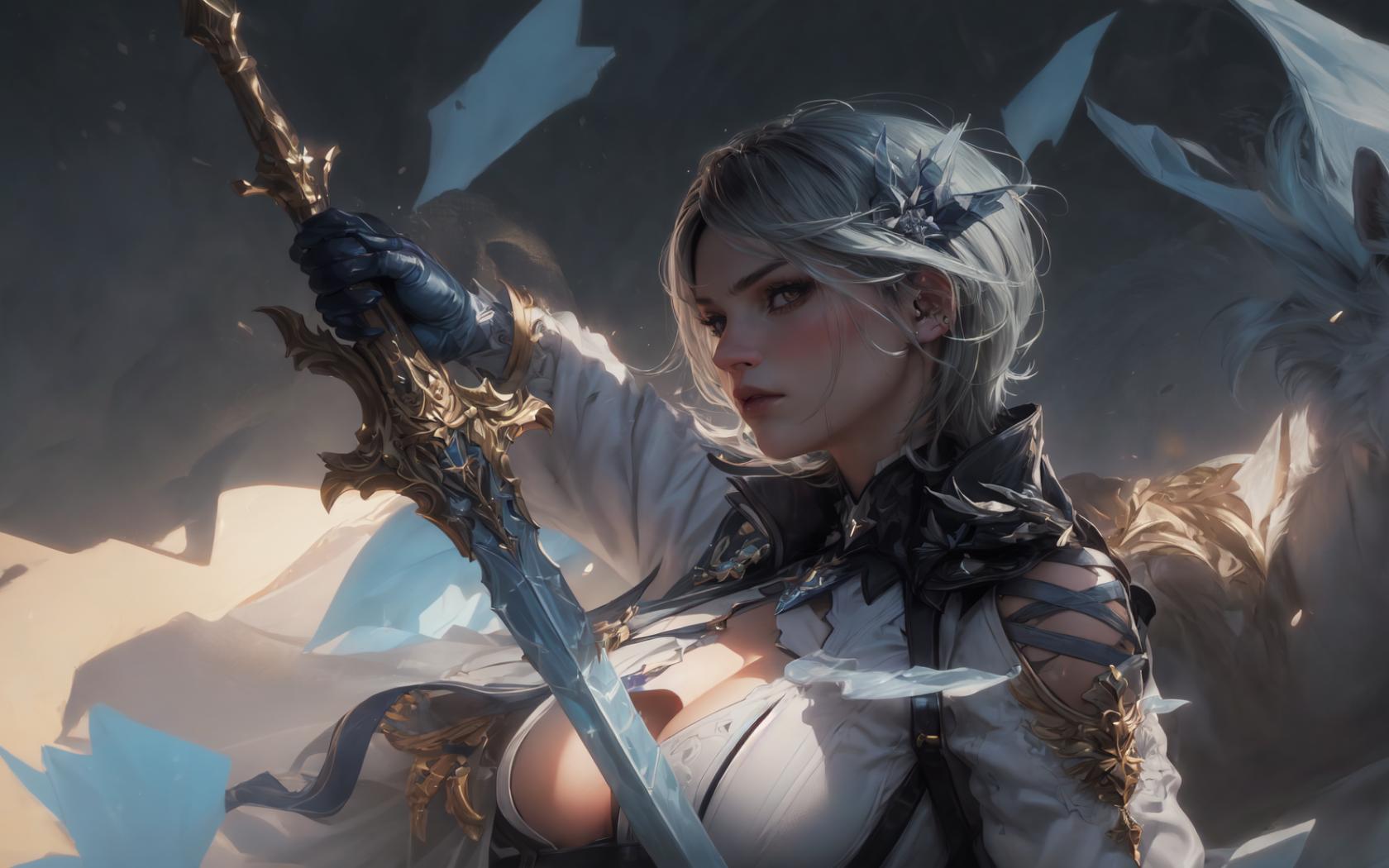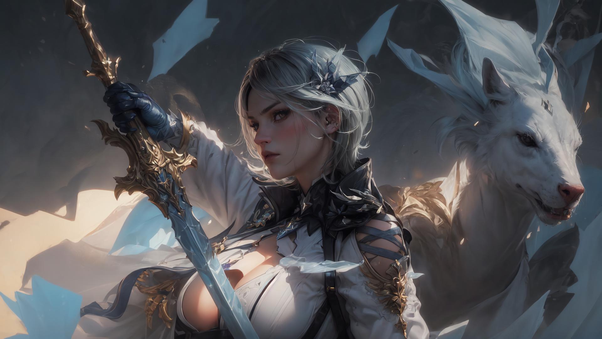 a woman dressed as a wolf stands next to her holding a sword in front of a large white horse by the water's edge