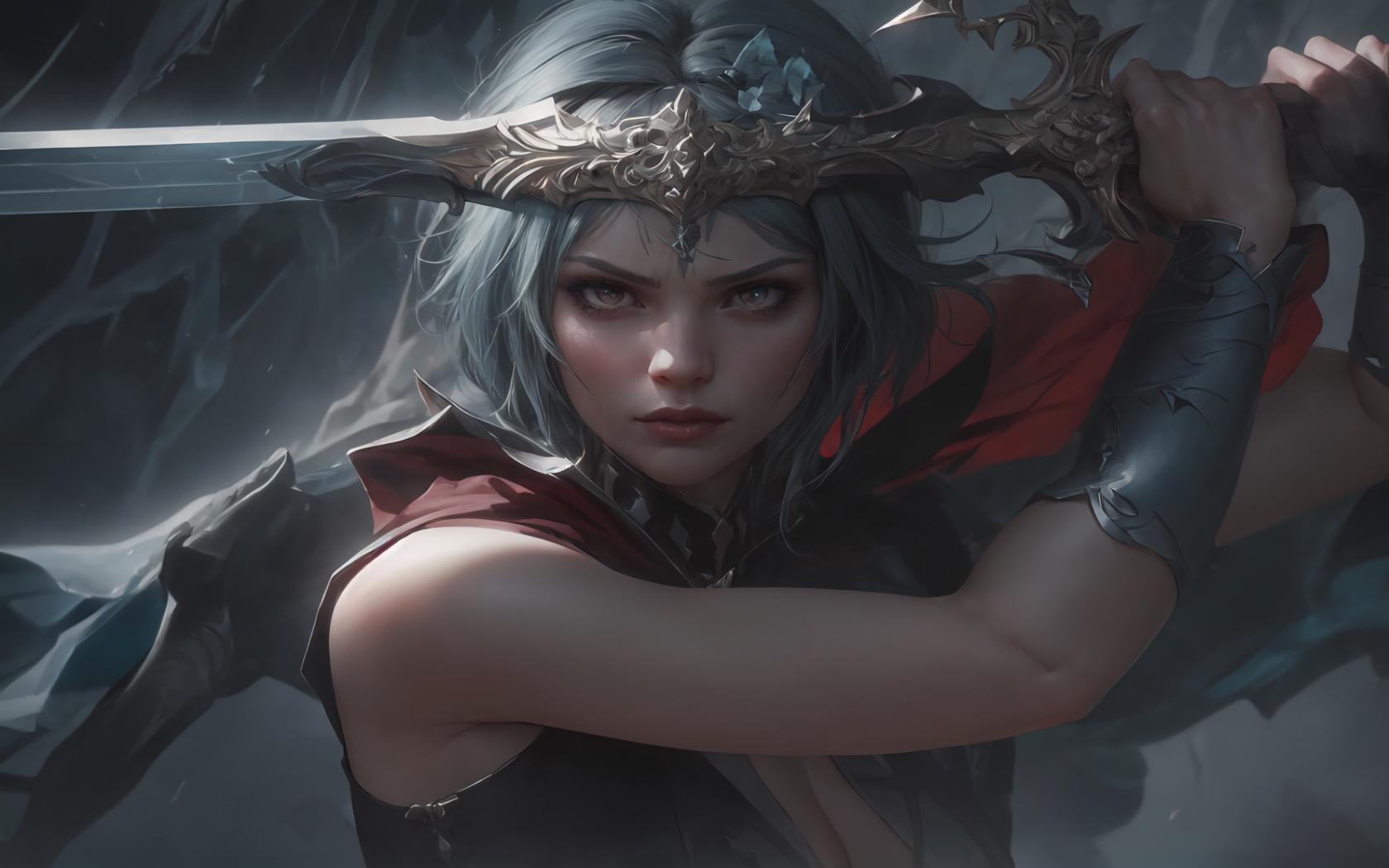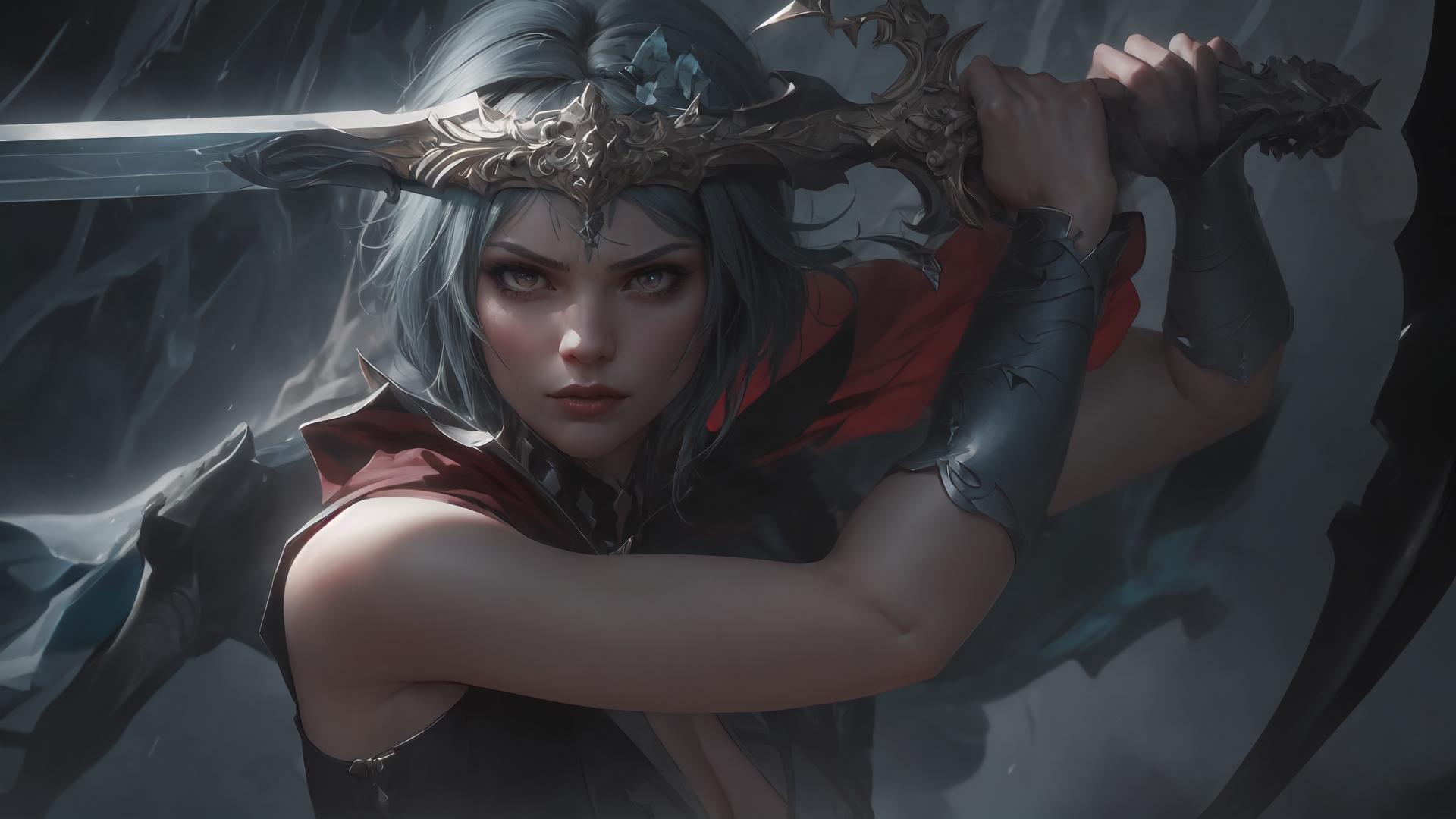 woman with sword in her hand while standing in front of dark background, digital painting with lighting effect image from the top right corner of face