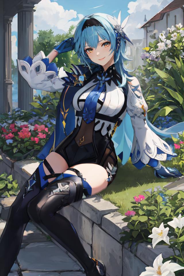 1girl, bangs, black footwear, black gloves, black hairband, black leotard, black thighhighs, blue hair, blue necktie, blue sky, blush, boots, cape, closed mouth, day, flower, gloves, hair ornament, hairband, high heel boots, high heels, high-waist shorts , large breasts, leotard, long sleeves, looking at viewer, medium hair, necktie, outdoors, sitting, sky, smile, solo, thigh boots, thighhighs, white flower, yellow eyes