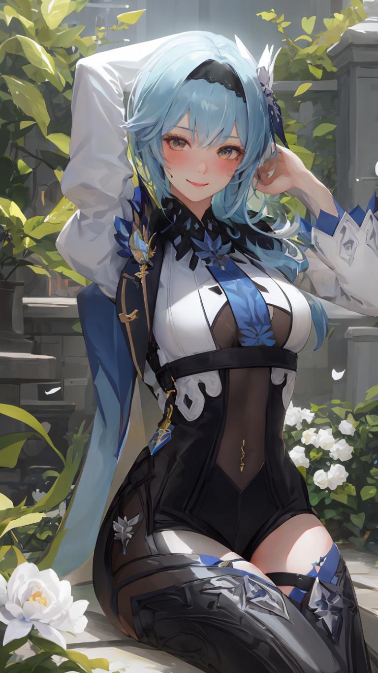 1girl, arms up, bangs, black hairband, black leotard, black thighhighs, blue hair, blue necktie, blush, bodystocking, cape, closed mouth, flower, hair ornament, hairband, high-waist shorts , large breasts, leotard, long sleeves, looking at viewer, medium breasts, medium hair, necktie, sitting, smile, solo, thighhighs, white flower, yellow eyes