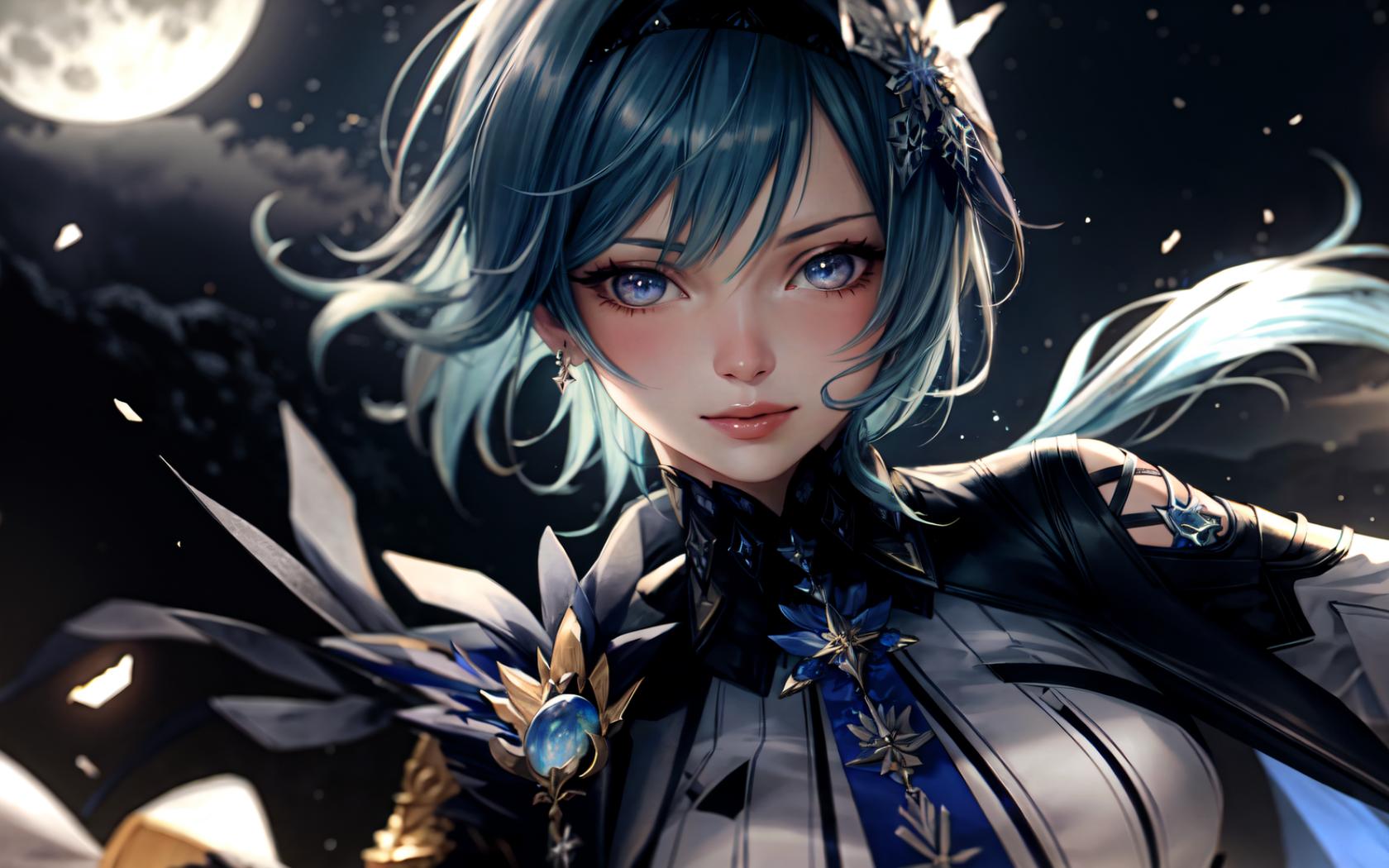 a beautiful anime with long blue hair sitting on a bench next to a full moon behind her on a cloudy day, with snow surrounding the sky