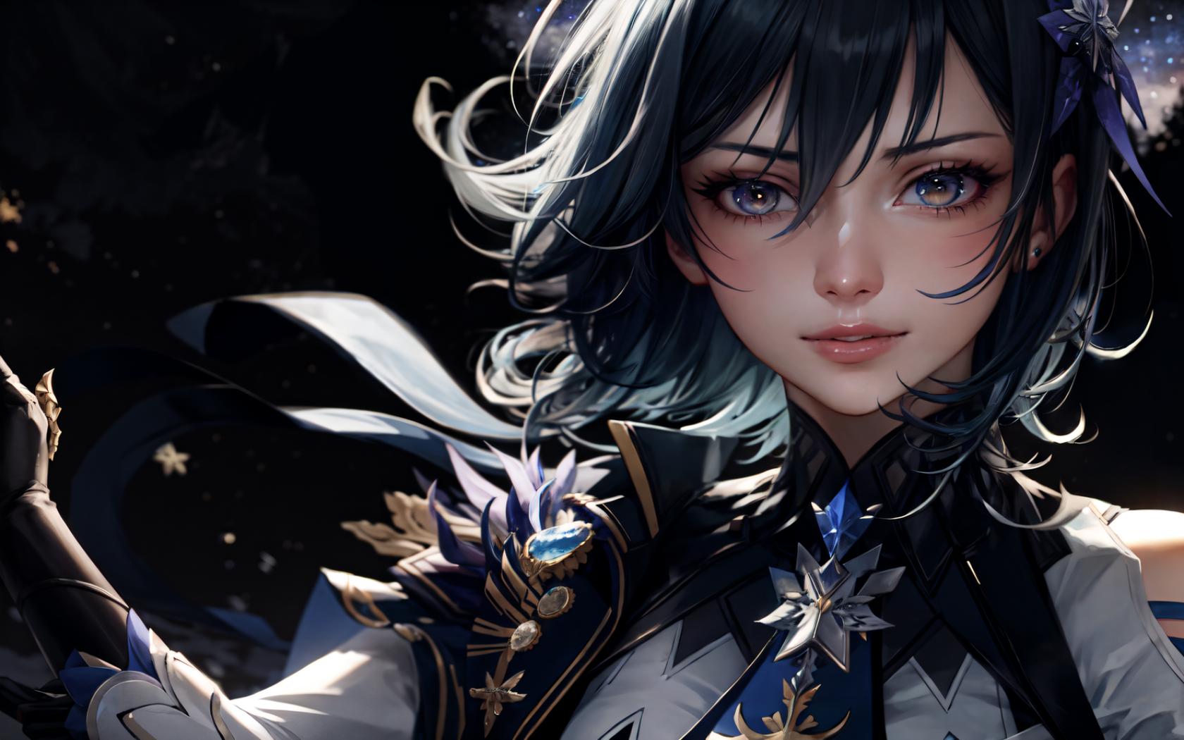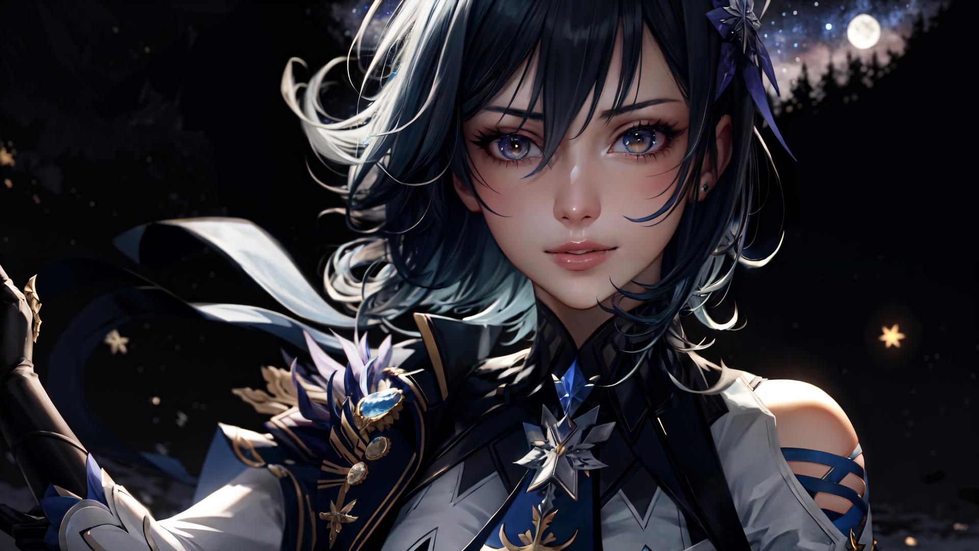 there is an asian character wearing a blue dress and black clothes and looking back over his shoulder to the side at night time with stars all around her