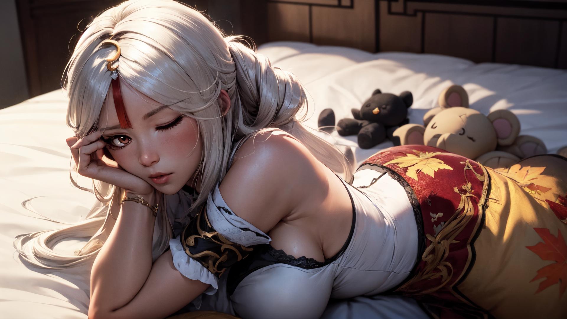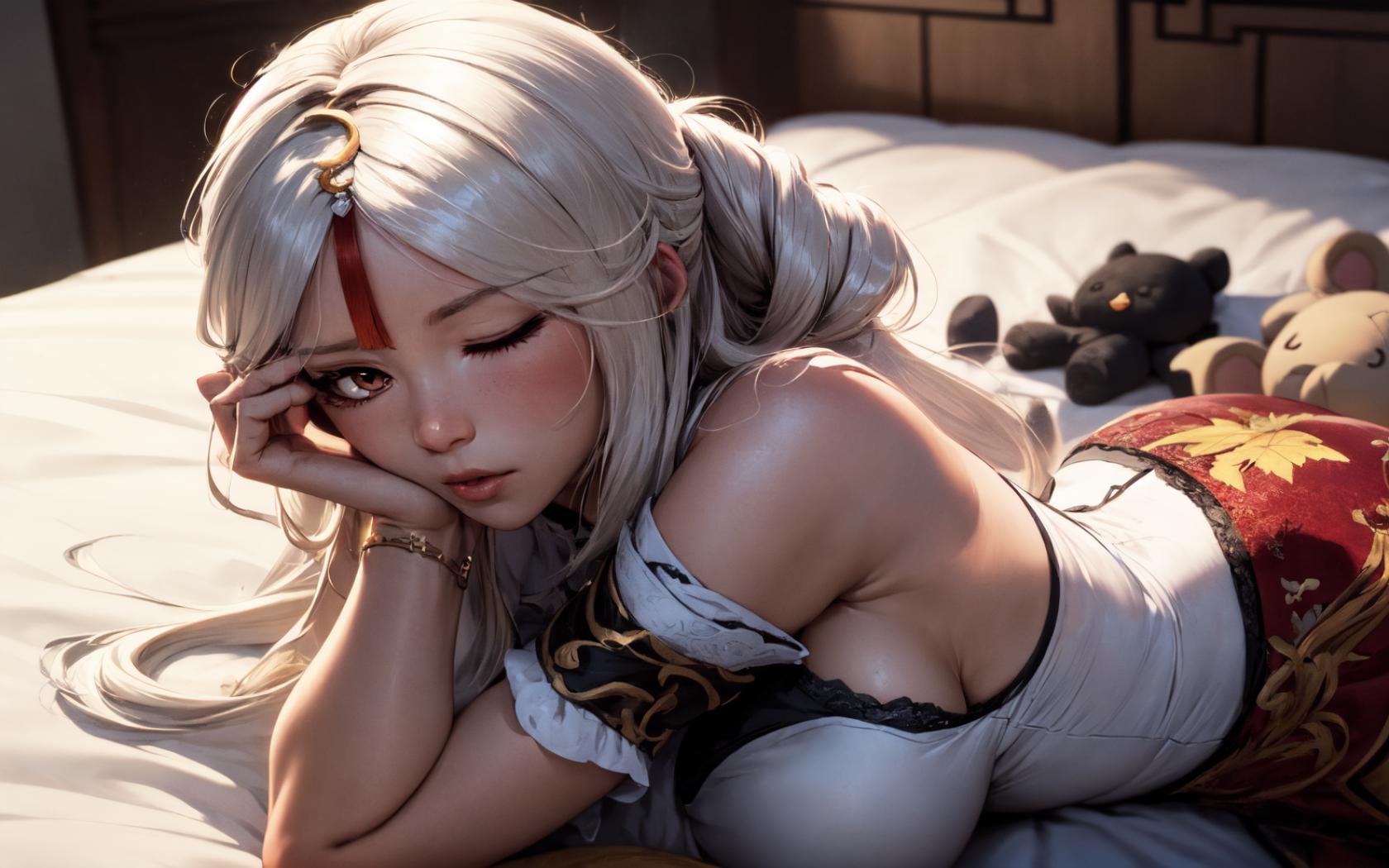 1girl, bangs, bare shoulders, blush, bracelet, claw ring , detached sleeves, dress, hair ornament, hair stick, hairpin, jewelry, large breasts, long hair, looking at viewer, lying, on bed, on stomach, one eye closed, parted bangs, parted lips, red eyes, sideboob, skirt, solo, stuffed animal, stuffed toy, tassel, white hair