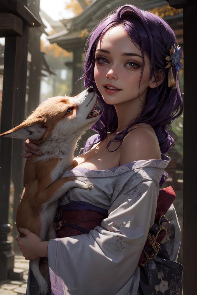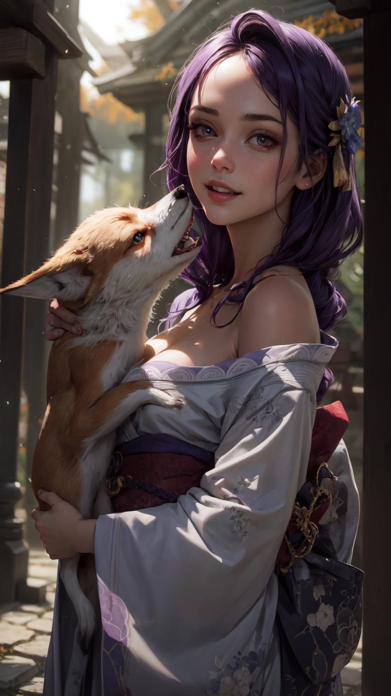 1girl, animal, architecture, bangs, bare shoulders, blue eyes, braid, cleavage, day, east asian architecture, floral print, flower, fox , from side, hair flower, hair ornament, holding, holding animal, japanese clothes, kimono, long hair, long sleeves, looking at viewer, medium breasts, mole, obi, off shoulder, open mouth, outdoors, parted lips, purple eyes, purple hair, realistic, sash, smile, solo, sunlight, wide sleeves