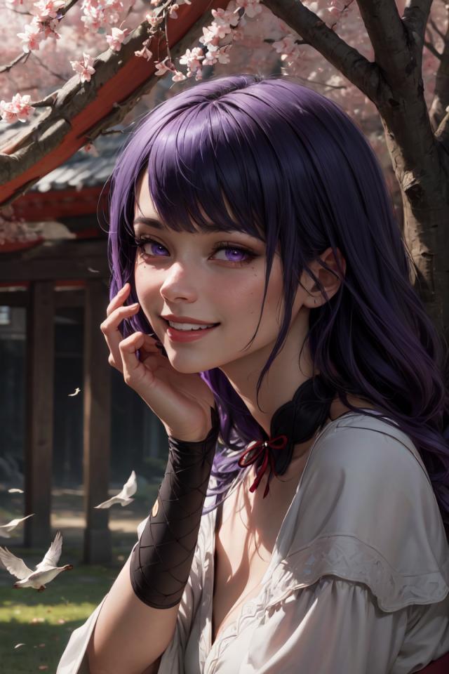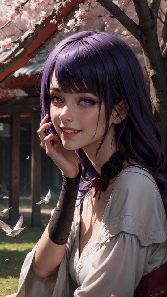 an asian girl has purple hair while talking on her cell phone outside by the tree in front of her house surrounded by flying birds and trees