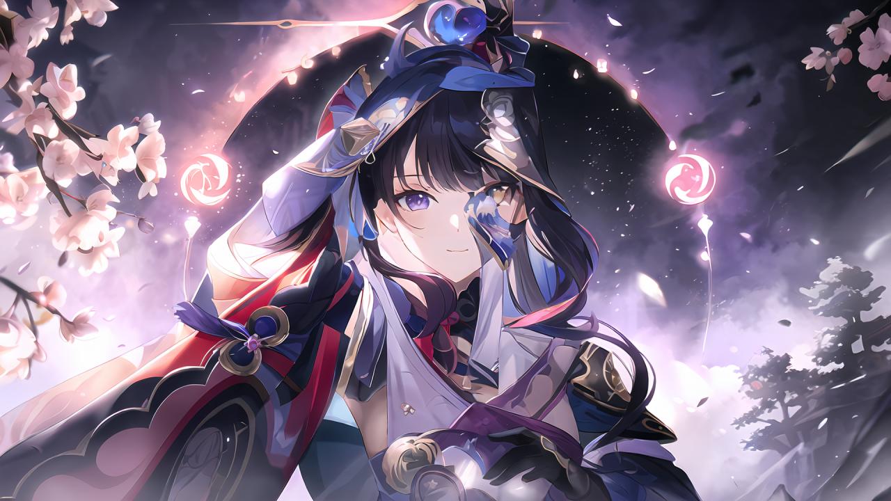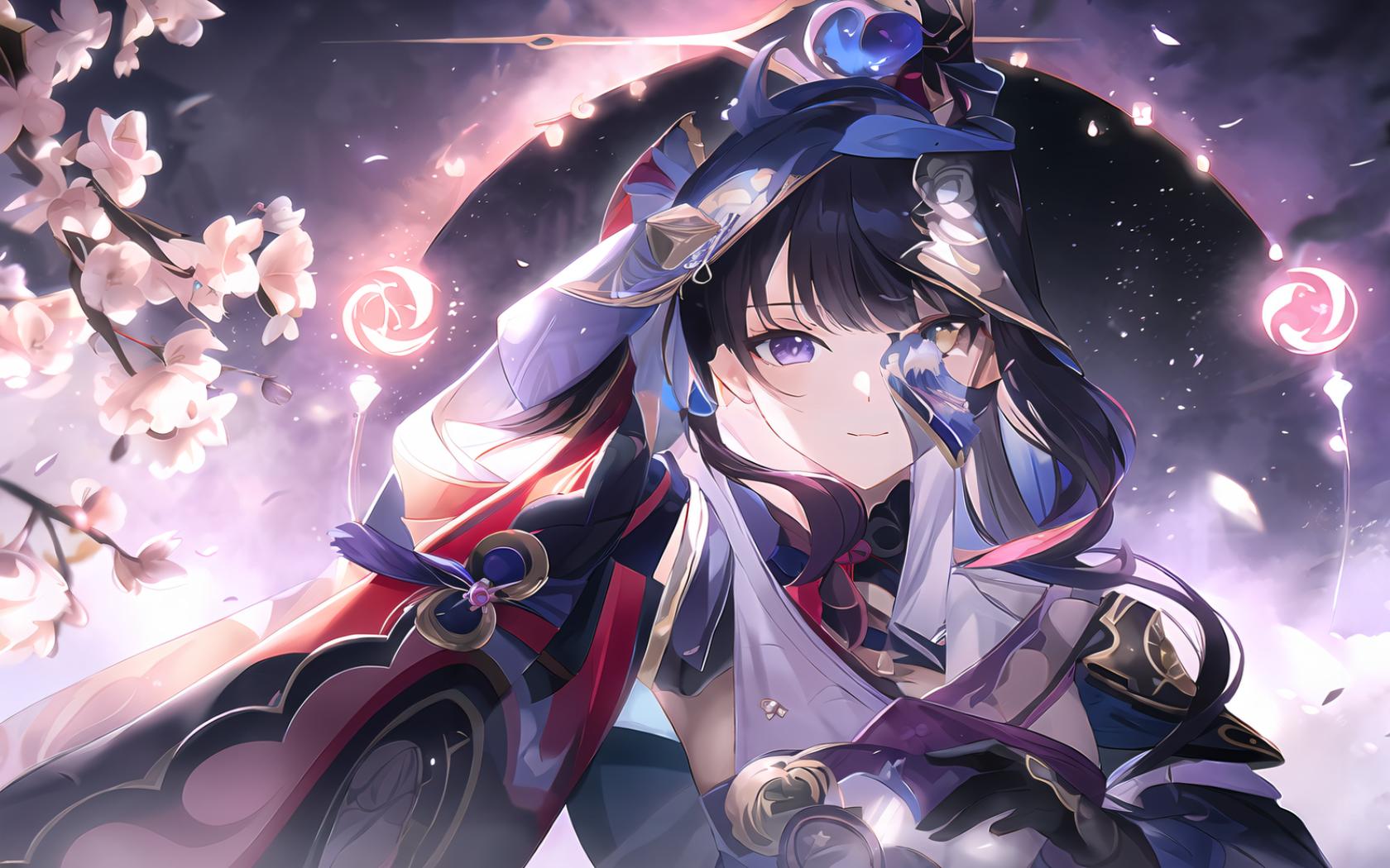 1girl, armor, bangs, black gloves, black hair, branch, cherry blossoms, closed mouth, flower, gloves, hair ornament, holding, japanese clothes, kimono, long hair, looking at viewer, mask, mitsudomoe (shape) , mole, mole under eye, moon, petals, purple eyes, purple hair, shoulder armor, sky, smile, solo, tomoe (symbol), upper body
