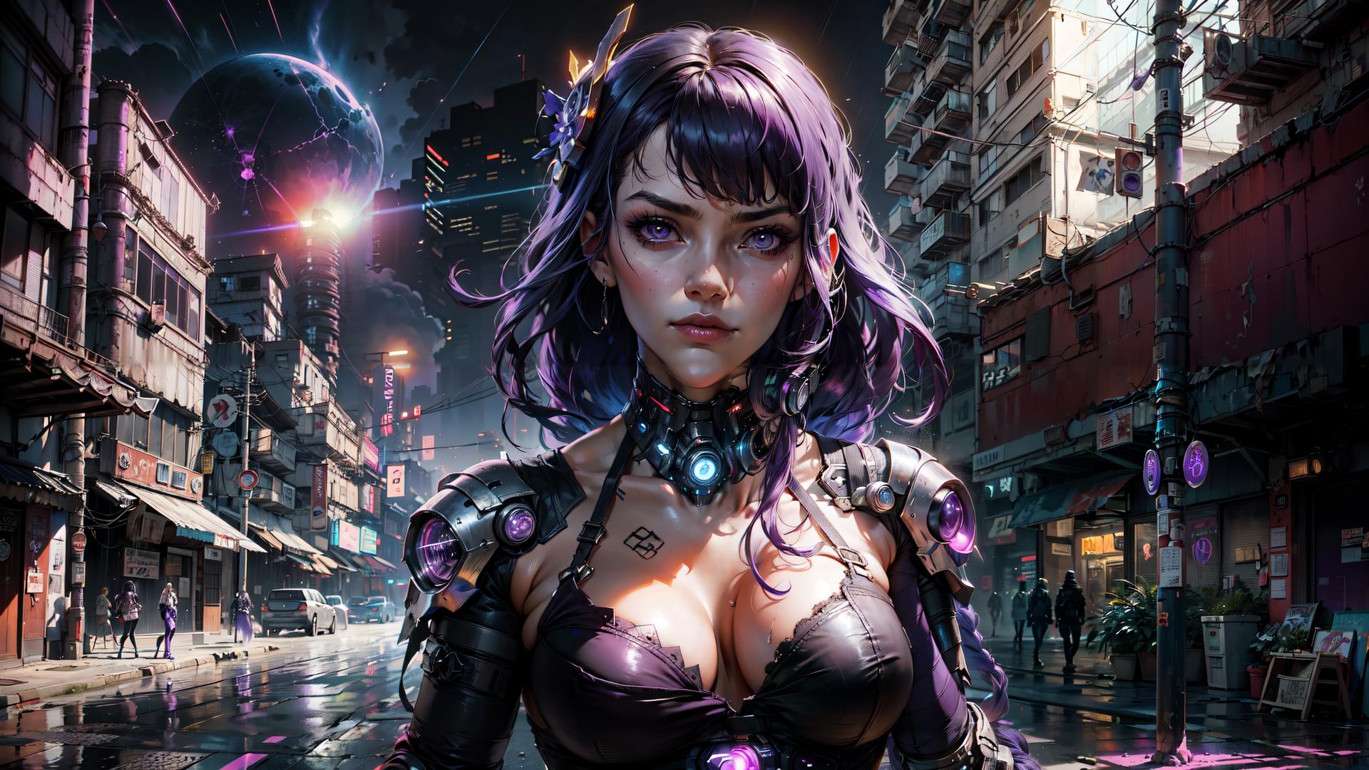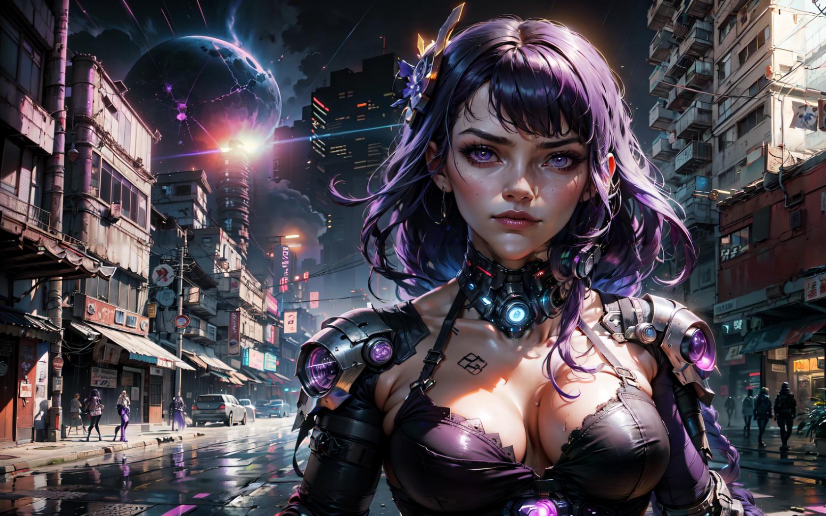 1girl, armor, artist name, bangs, bra, building, city, cleavage, collarbone, cyberpunk , cyborg, earrings, flower, hair flower, hair ornament, jewelry, large breasts, long hair, looking at viewer, mechanical arms, mole, night, outdoors, parted lips, purple eyes, purple hair, realistic, science fiction, shoulder armor, sign, sky, solo focus, torn clothes, underwear, upper body