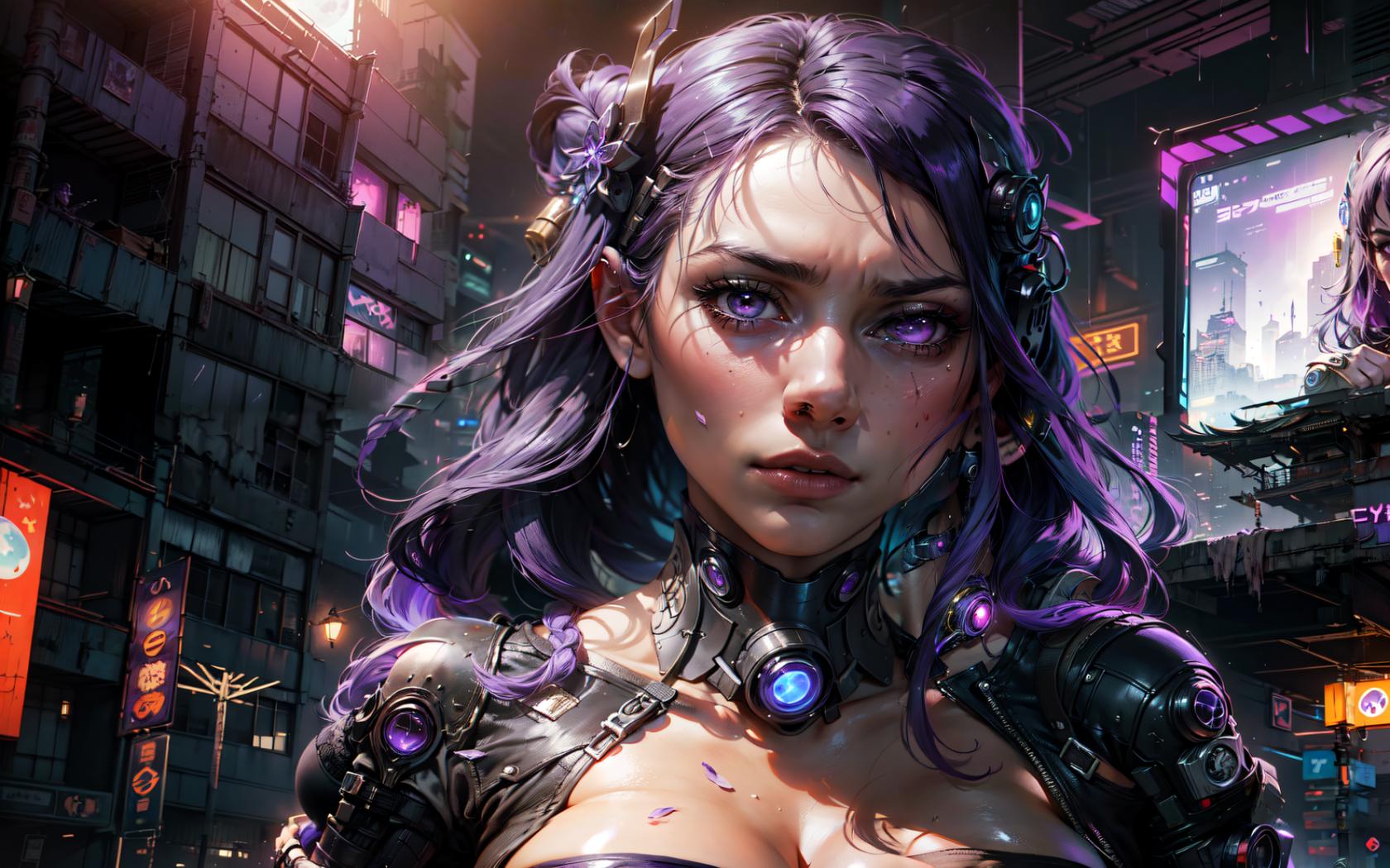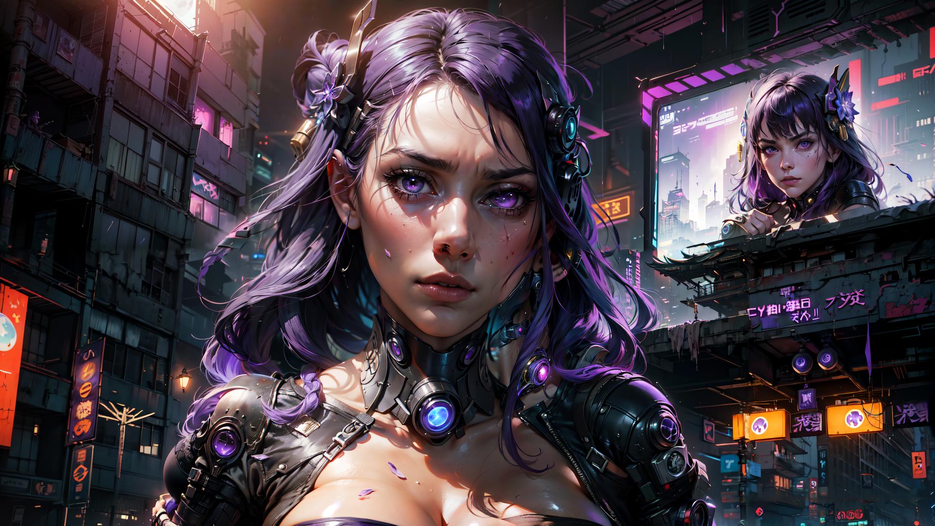 she looks hot dressed in a couture and outfit on her arm and chest above them are several neon lights with signs around her
