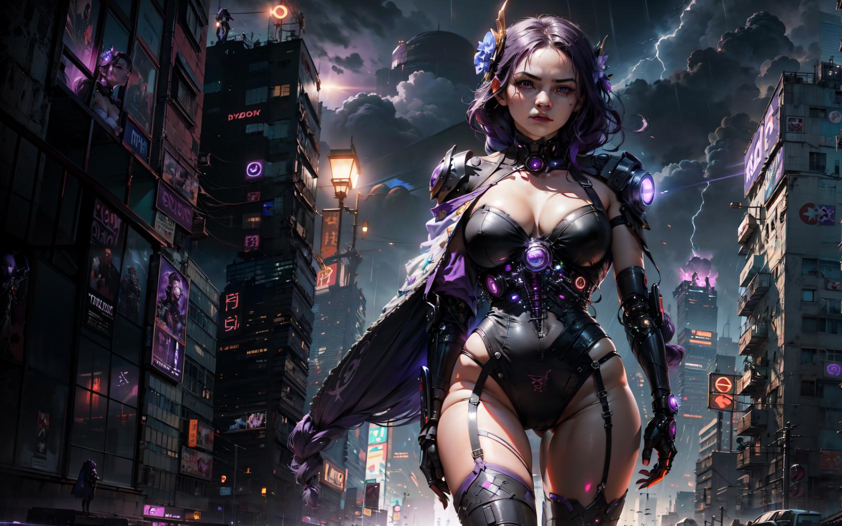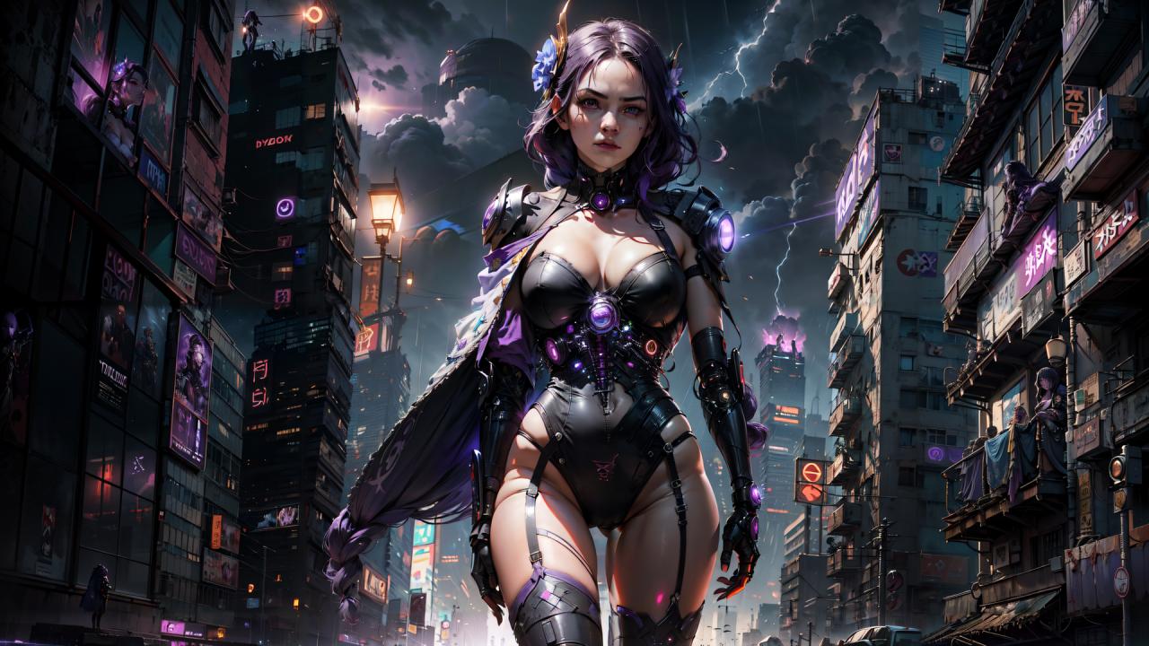 1girl, android, armor, arms at sides, ass visible through thighs, black gloves, black leotard, building, city, cleavage, cloud, cloudy sky, covered navel, cowboy shot, cyberpunk, flower, garter straps, gloves, glowing, hair flower, hair ornament, highleg, highleg leotard, large breasts, leotard, long hair, looking at viewer, makeup, mechanical arms, medium breasts, mole, neon lights , night, outdoors, parted lips, pauldrons, purple eyes, purple hair, rain, realistic, science fiction, shoulder armor, shrug (clothing), single mechanical arm, skindentation, sky, solo focus, standing, tattoo, thigh gap, thighhighs