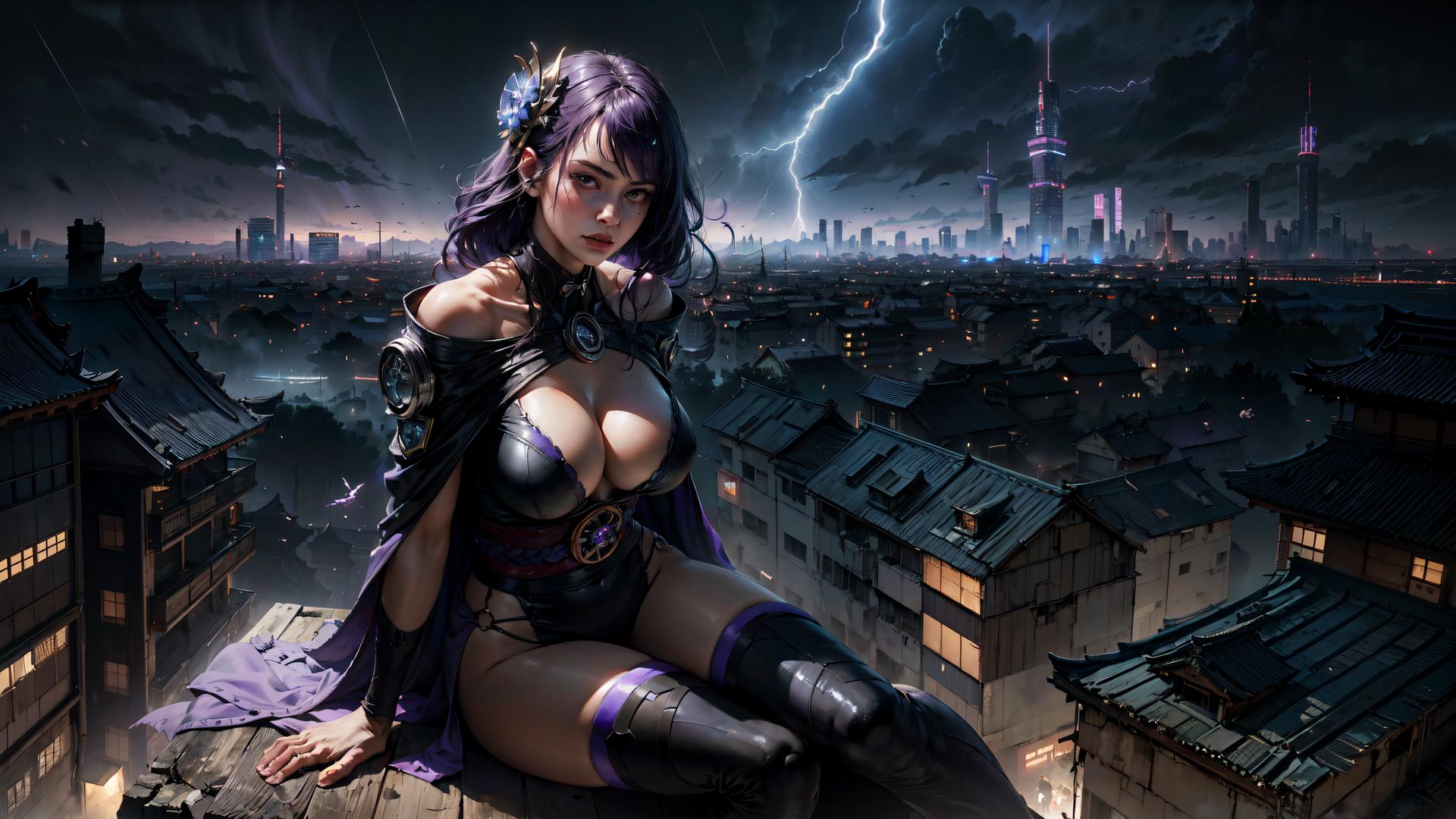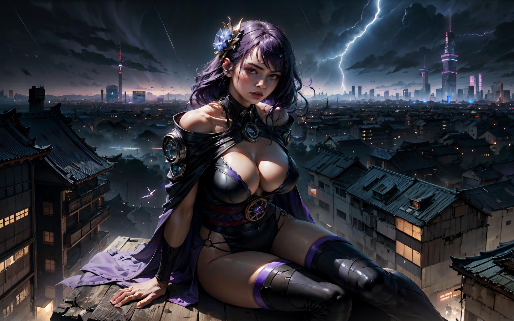 1girl, adapted costume, architecture, arm support, bangs, bare shoulders, black leotard, black thighhighs, boots, braid, building, cape, city, cityscape, cleavage, closed mouth, clothing cutout, cloud, cloudy sky, earrings, east asian architecture, flower, hair flower, hair ornament, jewelry, large breasts, leotard, lightning, long hair, looking at viewer, mole, mole under eye, night, night sky, obi, outdoors, pelvic curtain, purple eyes, purple hair, rain, rooftop , sash, sitting, sky, solo, thigh boots, thighhighs, vision (genshin impact)