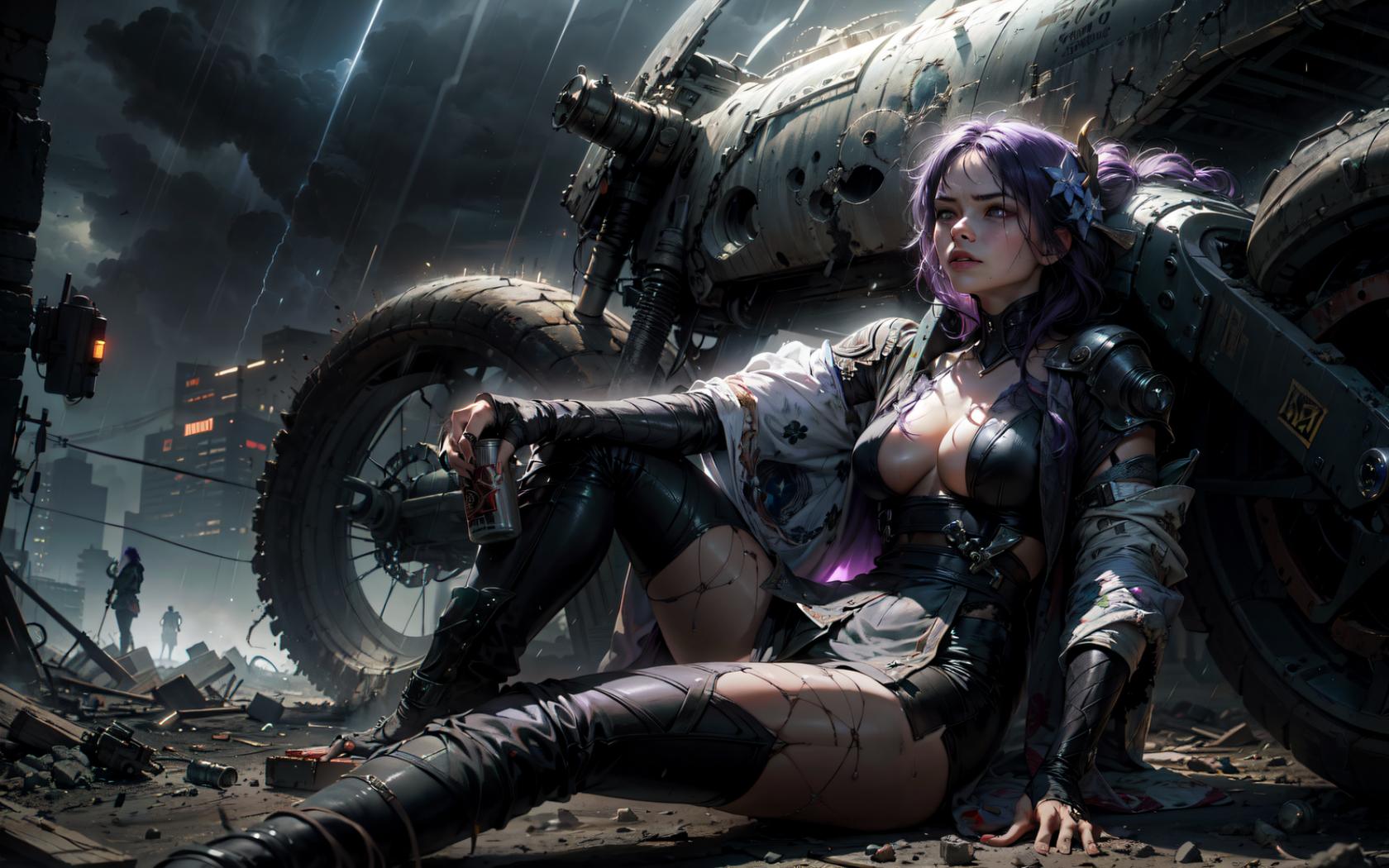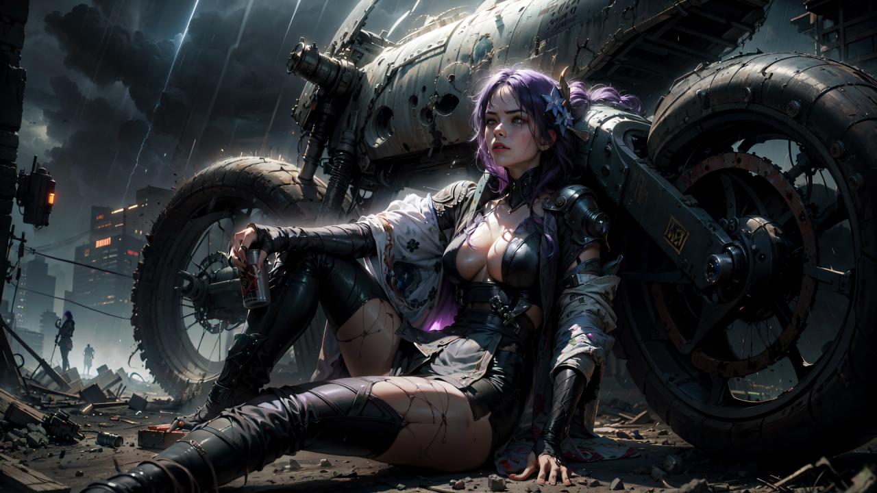 1girl, armor, black footwear, boots, can, cleavage, cloud, cloudy sky, cyberpunk , dirty, flower, ground vehicle, hair flower, hair ornament, holding, holding can, jacket, knee up, long hair, medium breasts, motor vehicle, motorcycle, outdoors, parted lips, purple hair, rain, shoulder armor, sitting, sky, solo, thigh boots, thighhighs, torn clothes