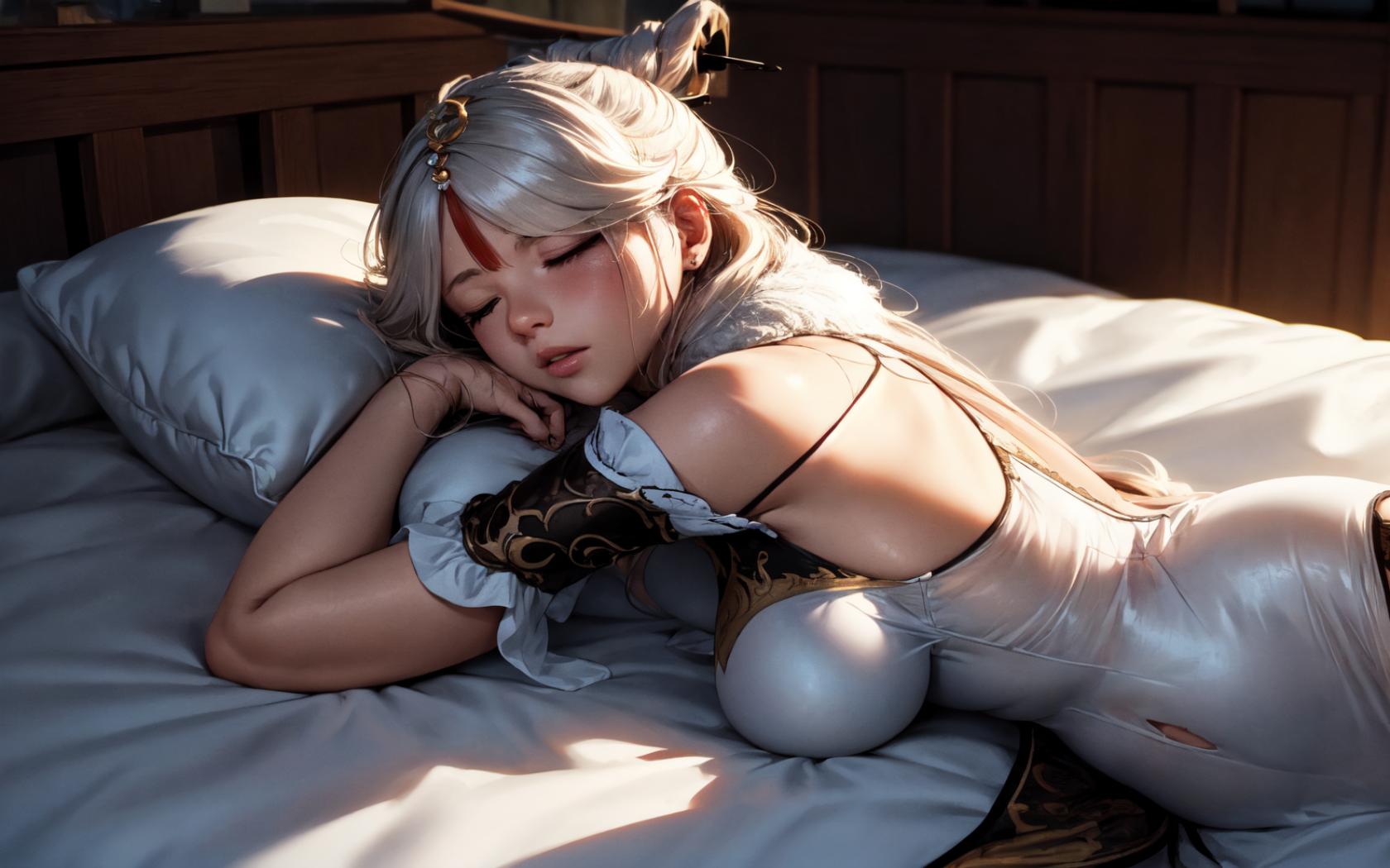 1girl, bangs, bare shoulders, barefoot, bed, bed sheet, china dress, chinese clothes, closed eyes, covered navel, detached sleeves, dress, hair ornament, hair stick , hairpin, indoors, large breasts, long hair, lying, on bed, on side, parted bangs, parted lips, pillow, sleeping, solo, tassel, white dress, white hair