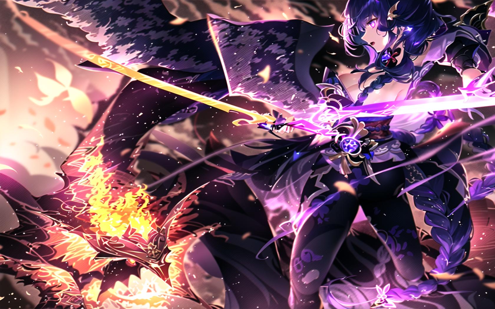 1girl, armor, bangs, braid, bridal gauntlets, cleavage, dragon, electricity, flower, hair ornament, holding, holding sword, holding weapon, japanese clothes, kimono, large breasts, long hair, long sleeves, mitsudomoe (shape), musou isshin (genshin impact) , obi, obiage, obijime, open mouth, purple eyes, purple hair, ribbon, sash, shoulder armor, solo, sword, tassel, thighhighs, tomoe (symbol), weapon, wide sleeves, wings
