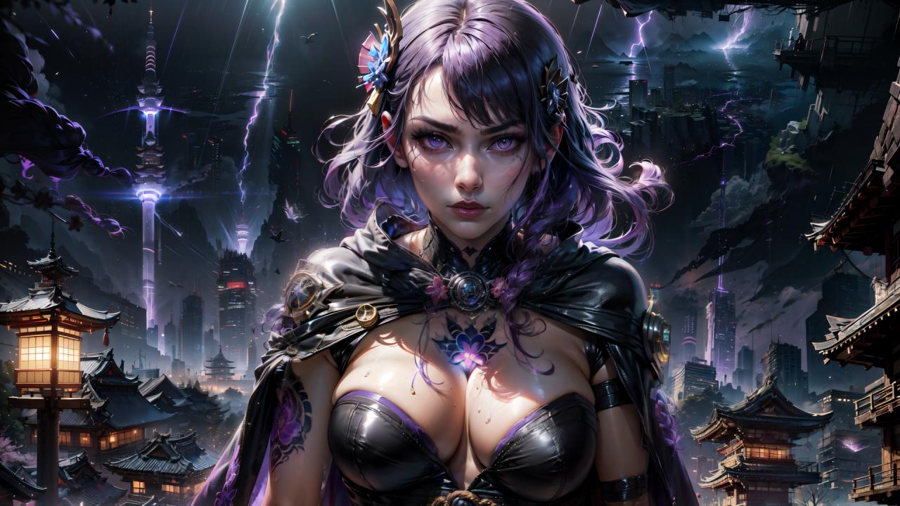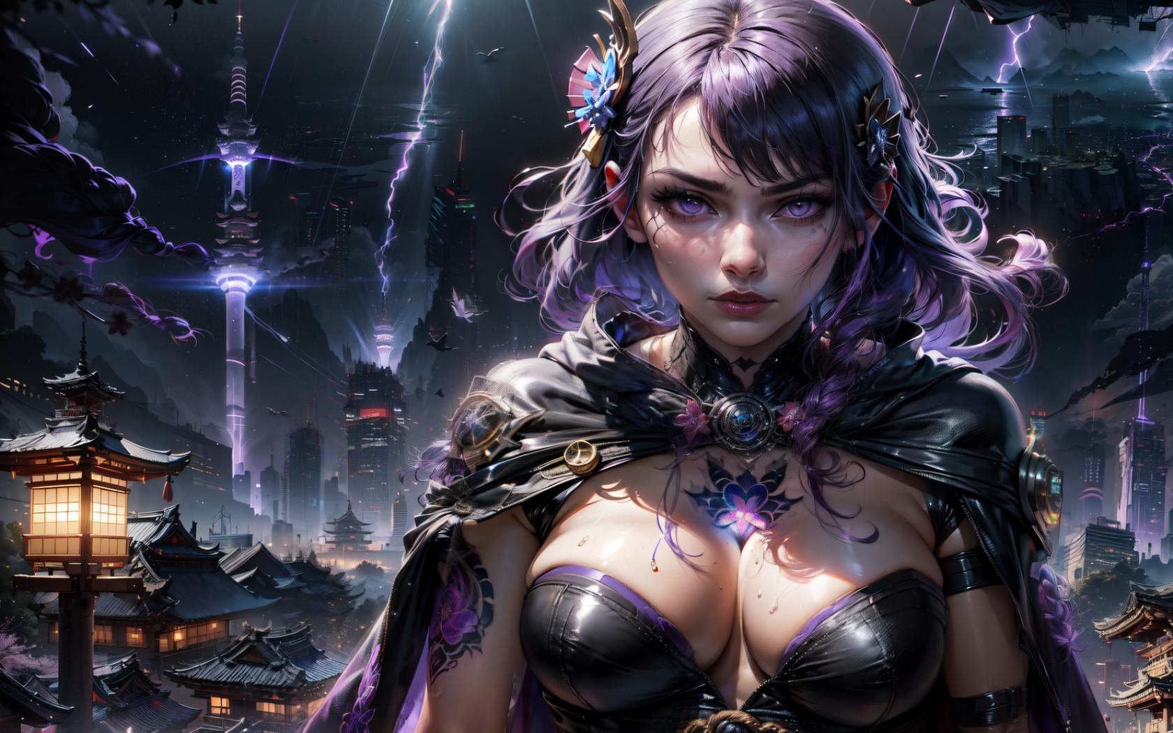 1girl, architecture, artist name, bangs, braid, building, cape, cleavage, cloud, cloudy sky, east asian architecture, electricity, eyelashes, flower, glowing, hair flower, hair ornament, jewelry, large breasts, lightning, long hair, looking at viewer, mole, mole on breast, mole under eye, night, outdoors, parted lips, purple eyes, purple flower, purple hair, realistic, sky, solo, straight-on, strapless, tattoo, tomoe (symbol) , upper body