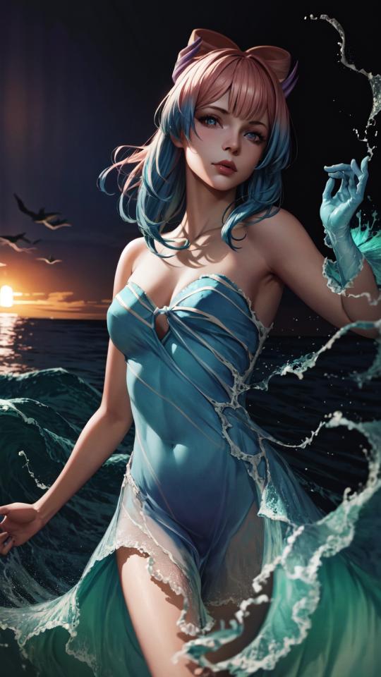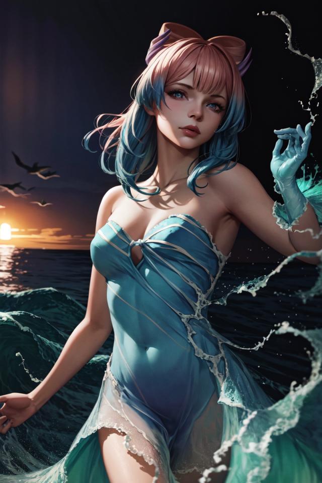 1girl, alternate costume, bangs, bare shoulders, blue dress, blue eyes, blue hair, blunt bangs, bow-shaped hair , cleavage, closed mouth, collarbone, colored tips, covered navel, cowboy shot, dress, gloves, gradient hair, hand up, long hair, looking at viewer, medium breasts, multicolored hair, ocean, pink hair, sky, solo, standing, strapless, strapless dress, two-tone hair, water, waves, white gloves