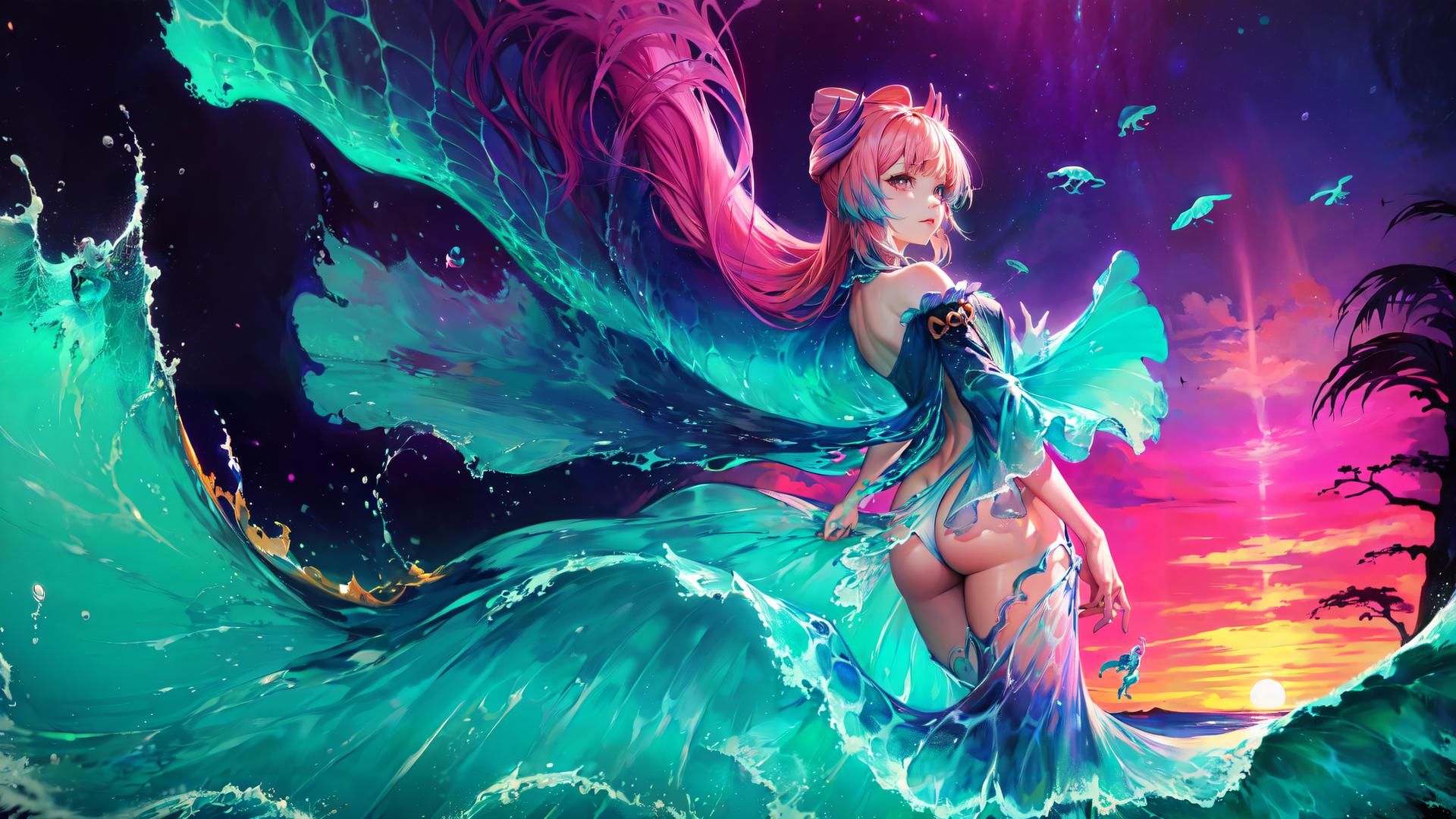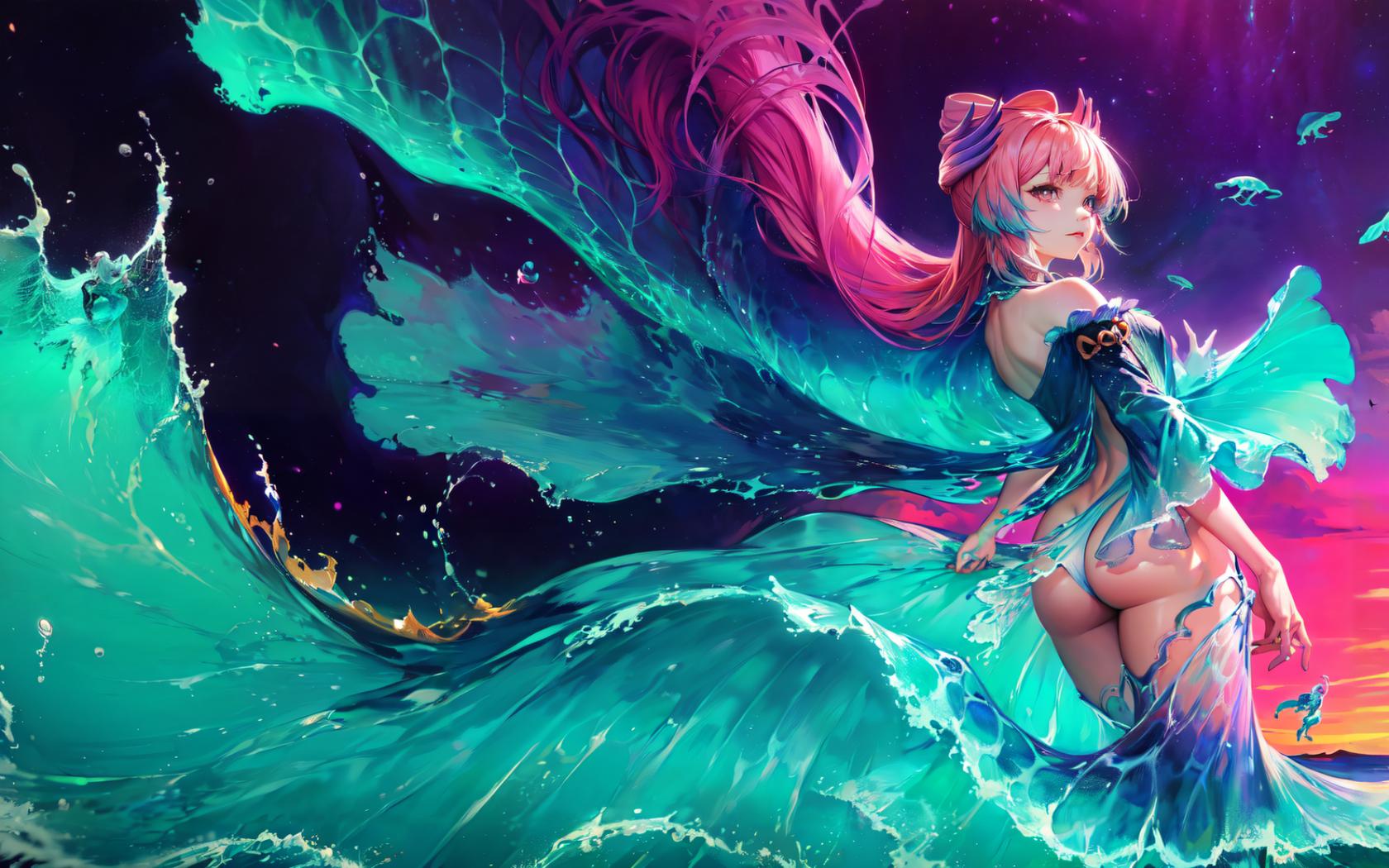 1girl, ass, bangs, bare shoulders, blue hair, bow-shaped hair , detached sleeves, fish, floating hair, frilled sleeves, frills, from behind, long hair, looking at viewer, looking back, multicolored hair, ocean, panties, parted lips, pink eyes, pink hair, purple eyes, sky, solo, thong, underwear, very long hair, water, wide sleeves