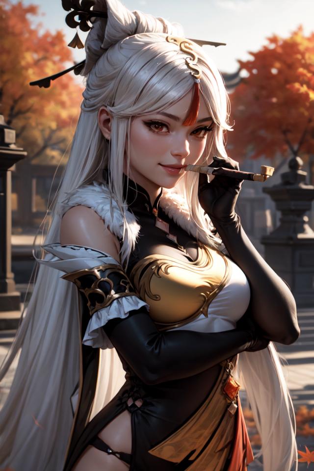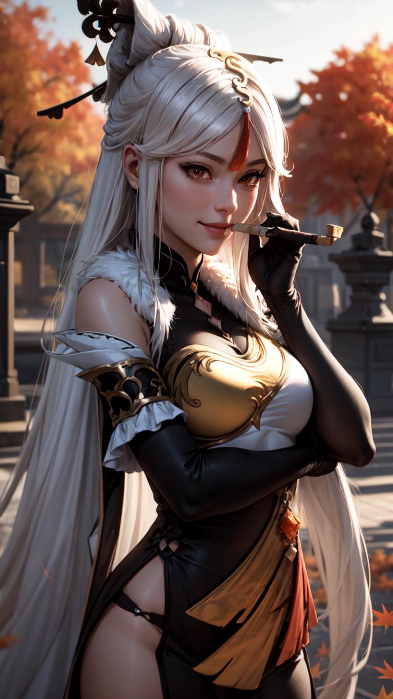 1girl, architecture, arm under breasts, autumn leaves, bangs, bare shoulders, black gloves, blurry, blurry background, brown eyes, china dress, chinese clothes, claw ring , closed mouth, cowboy shot, dress, east asian architecture, elbow gloves, fur collar, fur trim, gloves, hair ornament, hair stick, holding, holding smoking pipe, large breasts, leaf, long hair, looking at viewer, medium breasts, outdoors, panties, parted bangs, pelvic curtain, red eyes, side slit, sidelocks, smile, smoking pipe, solo, tassel, tree, underwear, very long hair, white hair