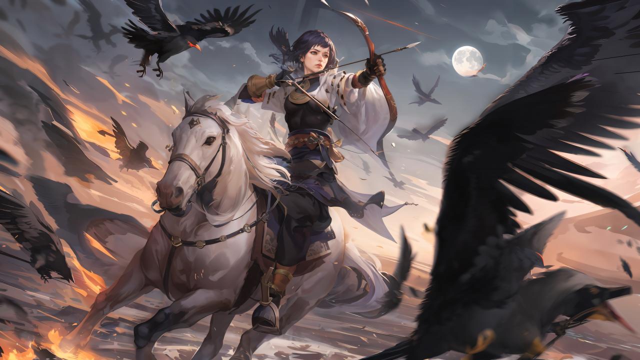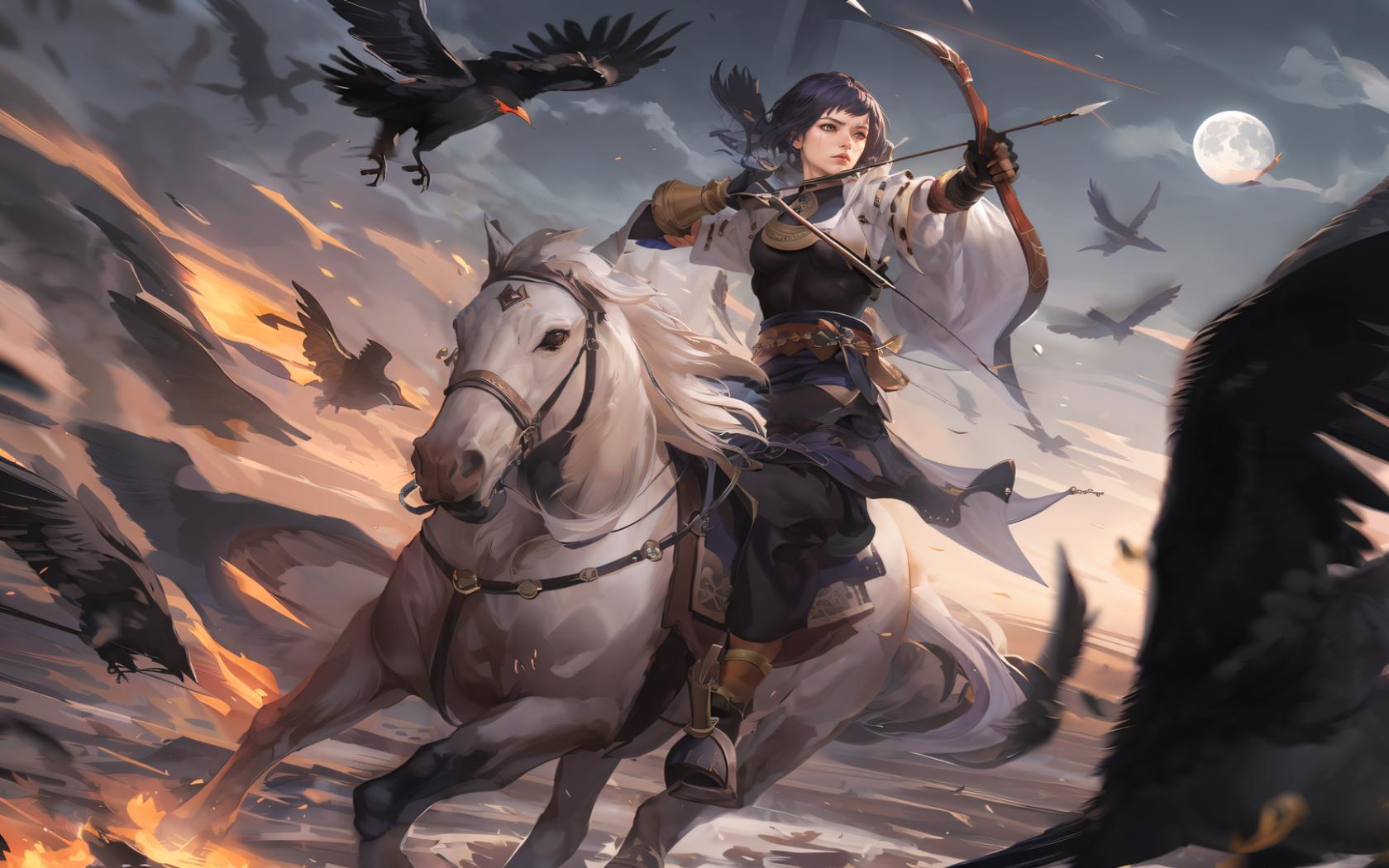 1girl, aiming, animal, archery , arrow (projectile), bird, black hair, bow (weapon), brown gloves, cloud, crow, drawing bow, eagle, feathers, full moon, gloves, holding, holding bow (weapon), holding weapon, horse, horseback riding, japanese clothes, moon, outdoors, outstretched arm, riding, sky, solo, weapon