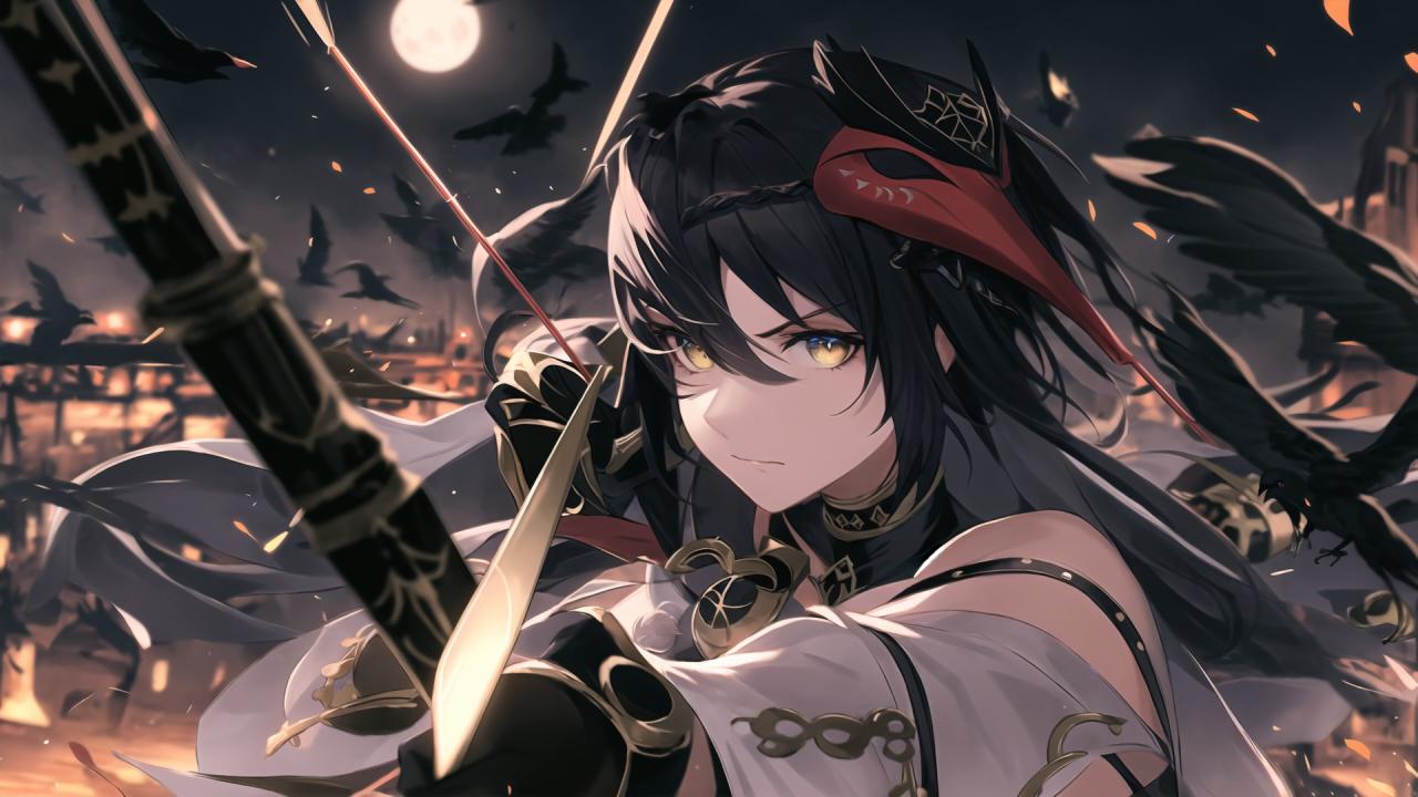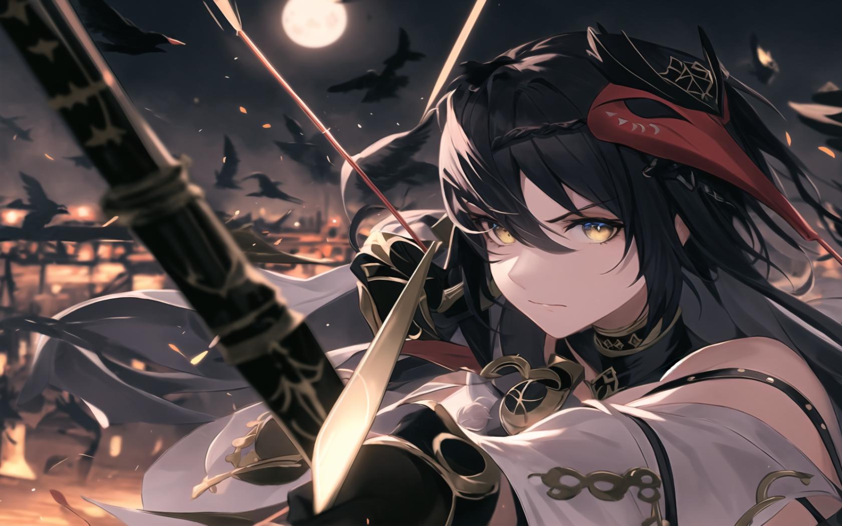 1girl, bangs, bare shoulders, bird, bird mask , black gloves, black hair, bow (weapon), closed mouth, crow, detached sleeves, full moon, gloves, hair between eyes, holding, holding bow (weapon), holding weapon, long hair, looking at viewer, mask, mask on head, moon, night, outdoors, sky, solo, upper body, weapon, yellow eyes