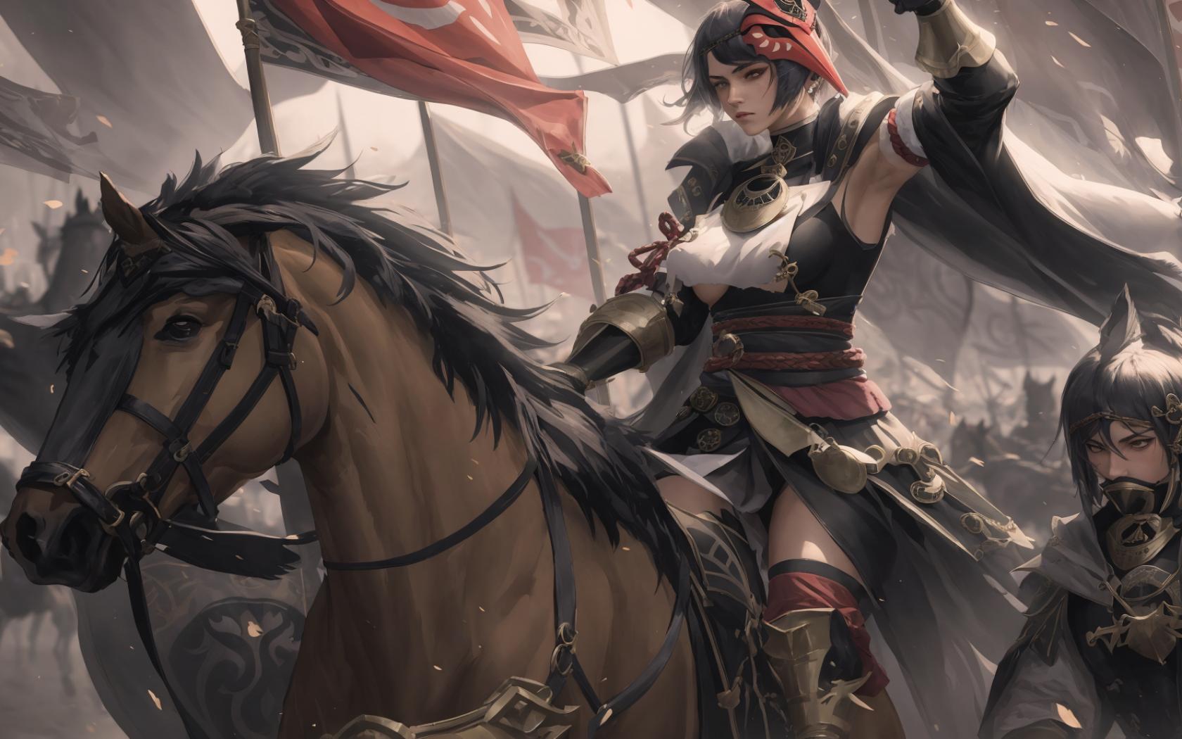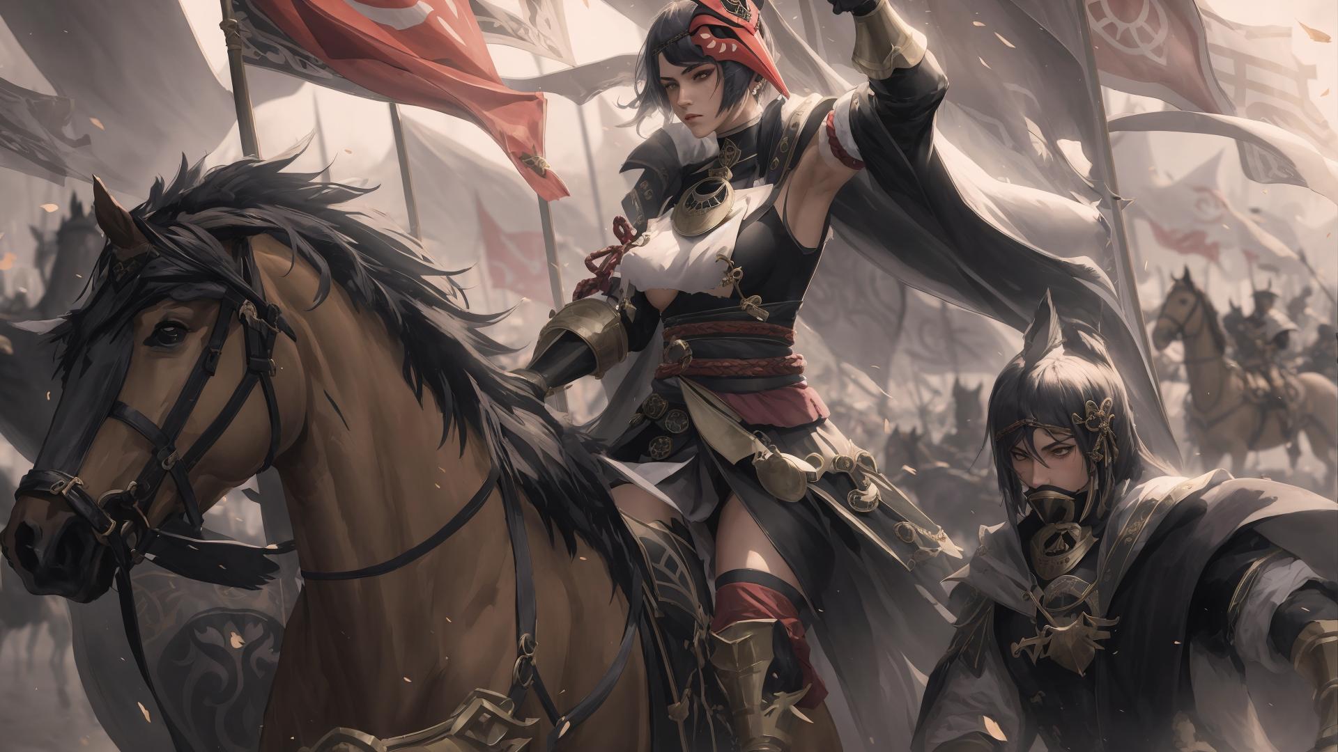 1girl, arm up, armor, armpits, army , bangs, banner, bird mask, black gloves, black hair, detached sleeves, flag, gloves, holding, holding flag, holding weapon, horse, horseback riding, japanese clothes, mask, mask on head, multiple boys, multiple others, polearm, riding, saddle, sash, short hair, tassel, thighhighs, weapon, wide sleeves, yellow eyes