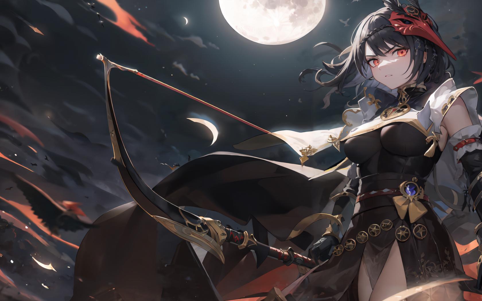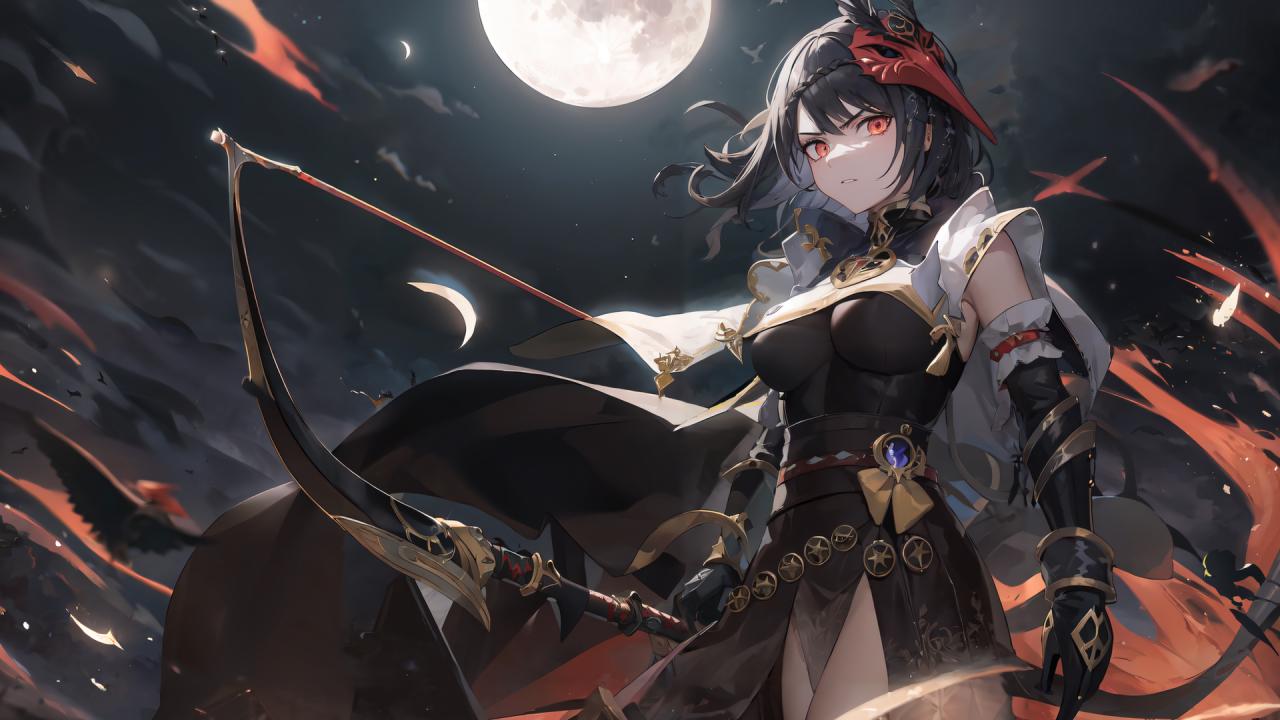 1girl, bangs, bird mask , black gloves, black hair, bow (weapon), closed mouth, cloud, full moon, gloves, holding, holding bow (weapon), holding weapon, large breasts, looking at viewer, mask, mask on head, moon, night, night sky, outdoors, red eyes, short hair, sky, solo, tassel, vambraces, vision (genshin impact), weapon