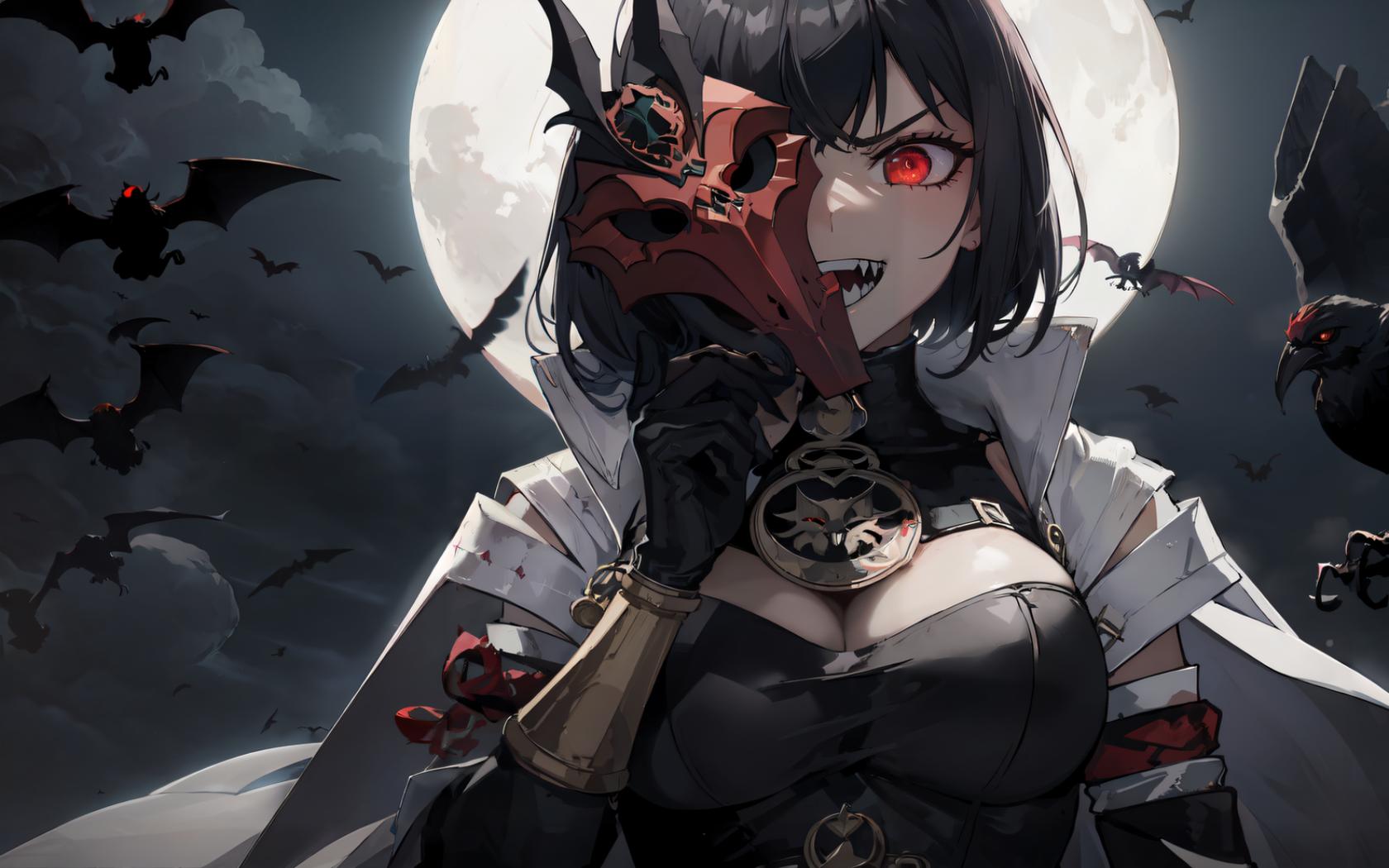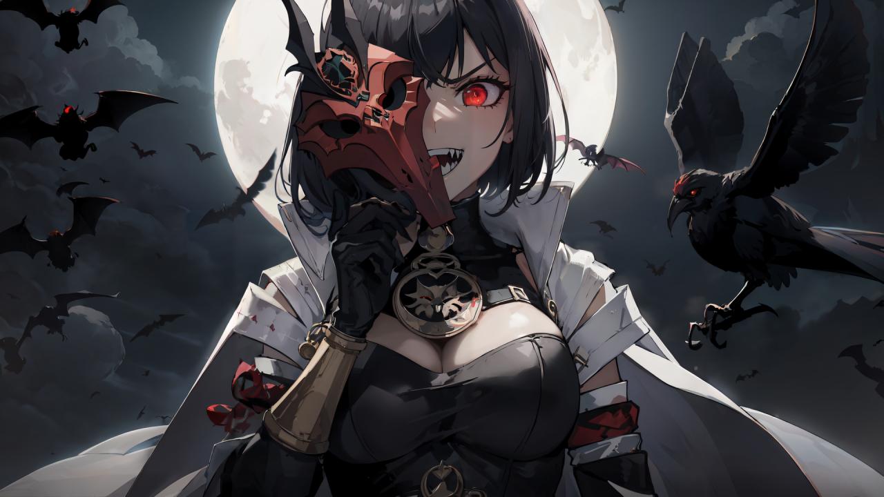 1girl, bangs, bat (animal), bird, bird mask , black gloves, black hair, cleavage, cloud, crow, full moon, gloves, holding, holding mask, large breasts, looking at viewer, mask, moon, night, open mouth, red eyes, short hair, sky, smile, solo, upper body