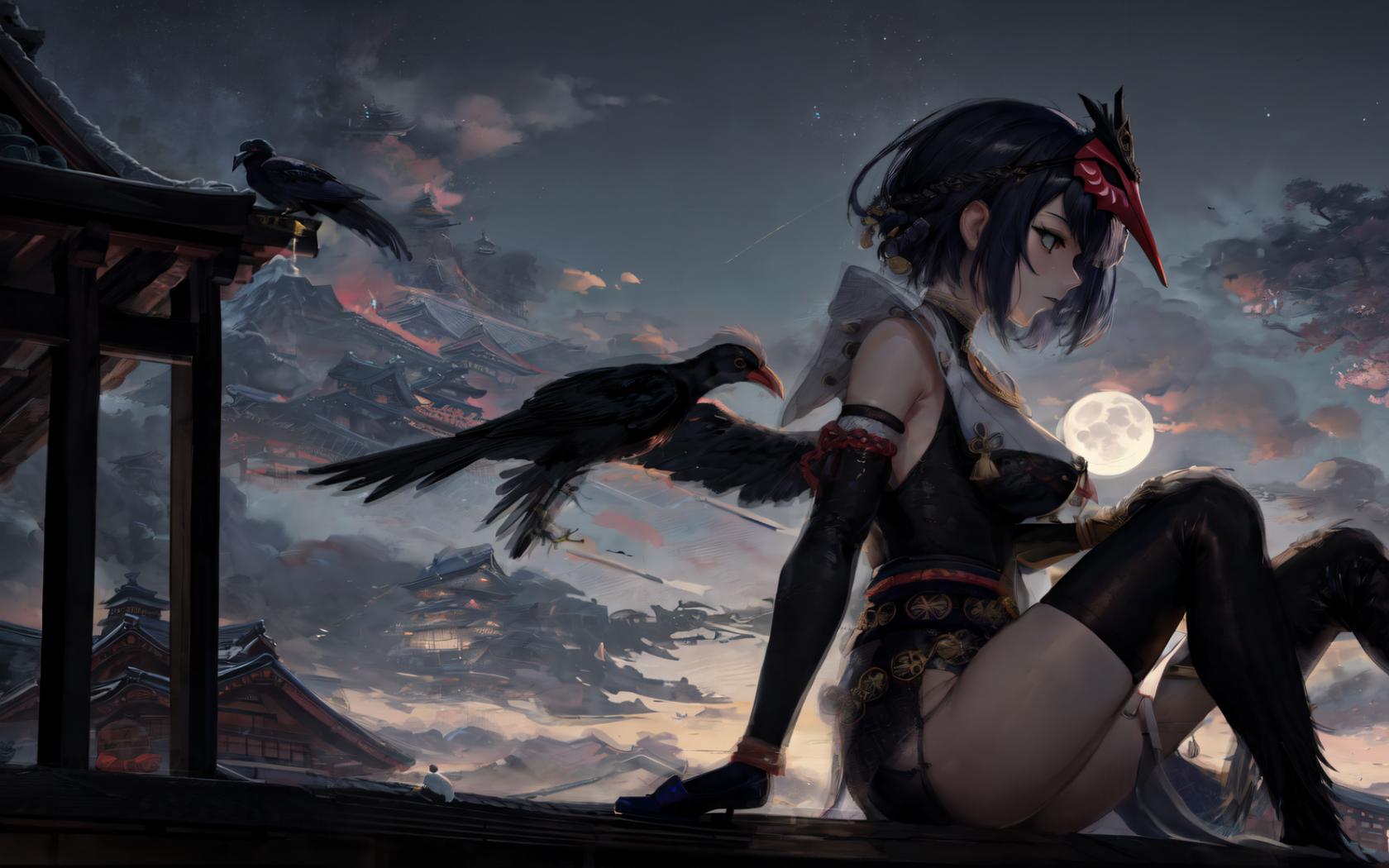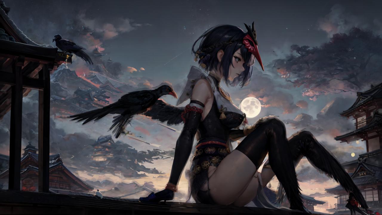 1girl, architecture, arm support, bangs, bird, bird mask , black gloves, black hair, black thighhighs, black wings, building, cloud, cloudy sky, crow, detached sleeves, east asian architecture, elbow gloves, from side, gloves, hand on own knee, japanese clothes, jewelry, large breasts, mask, mask on head, obi, outdoors, profile, sash, short hair, sitting, sky, solo, thighhighs, wings, yellow eyes