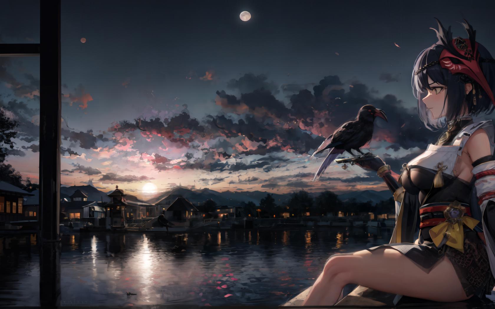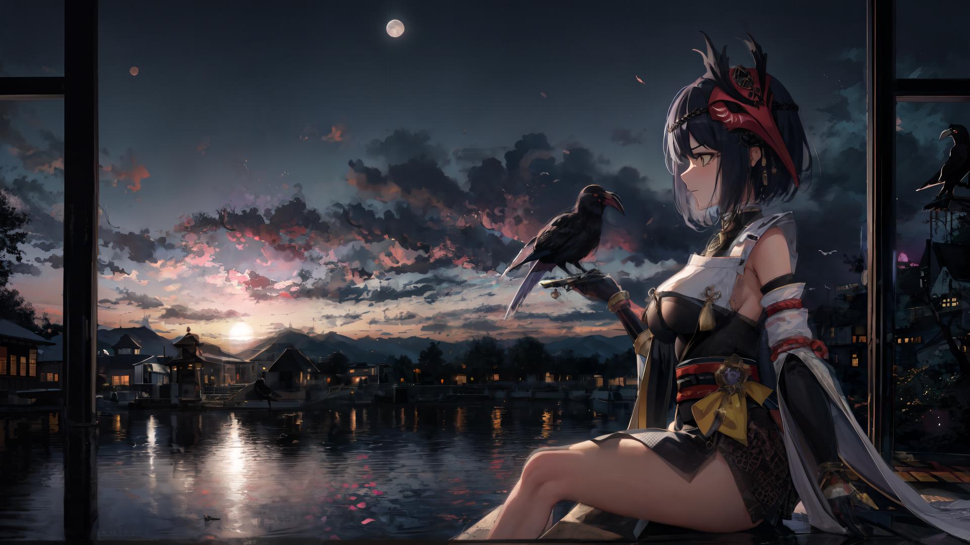 1girl, architecture, bird, bird mask , black gloves, black hair, closed mouth, cloud, cloudy sky, crow, detached sleeves, east asian architecture, from side, full moon, gloves, japanese clothes, large breasts, mask, mask on head, moon, night, obi, sash, scenery, short hair, sideboob, sitting, sky, solo, water, wide sleeves, yellow eyes