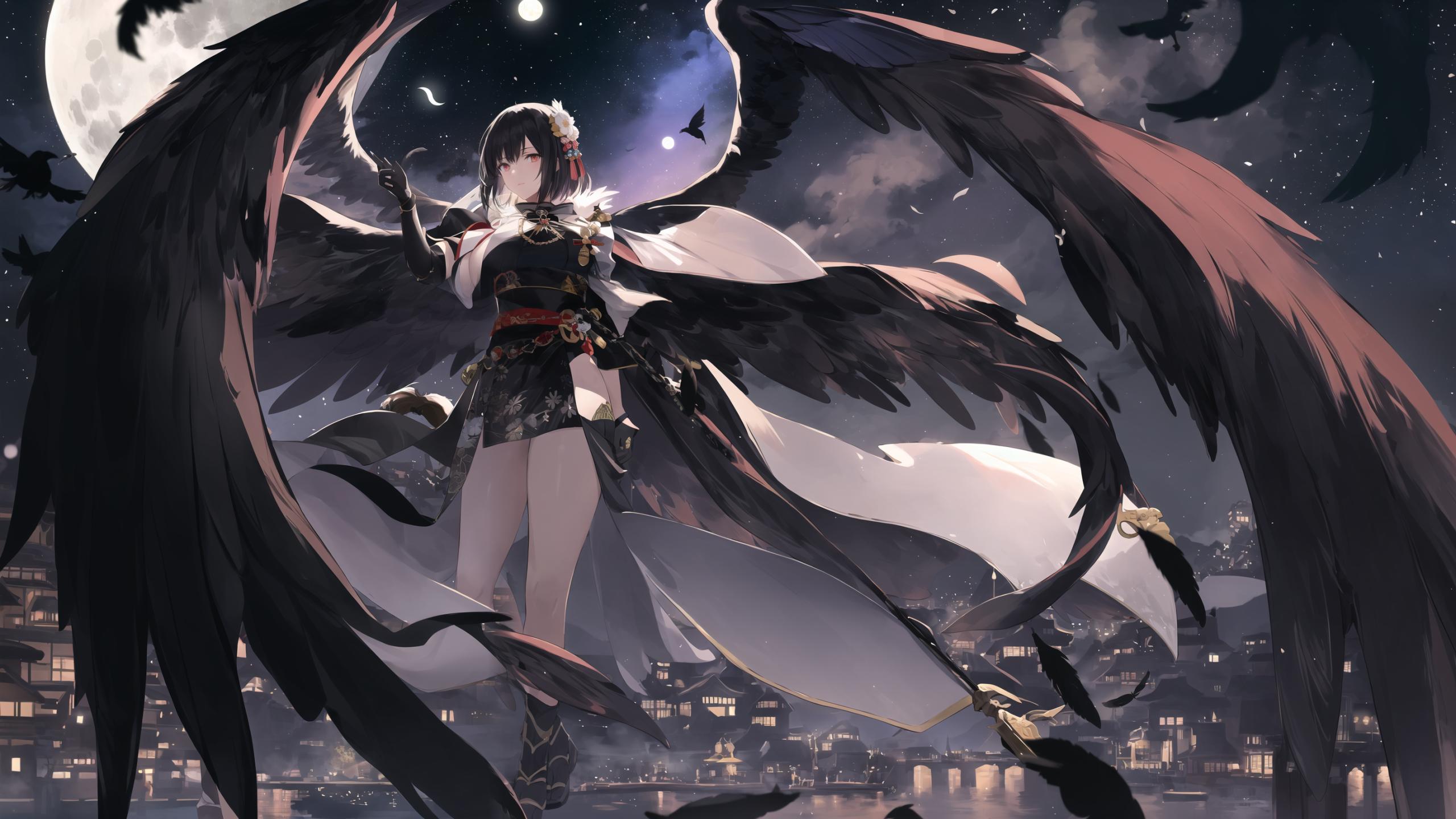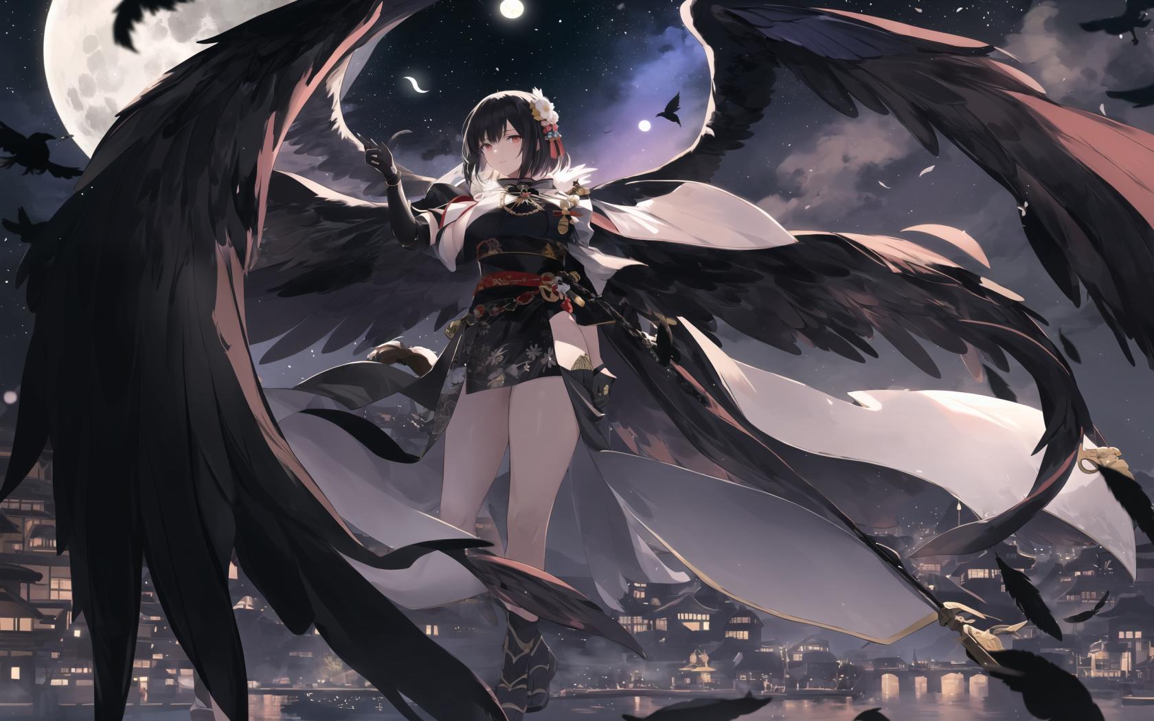 1girl, bangs, bird mask , black feathers, black gloves, black hair, black wings, feathered wings, feathers, flower, full moon, gloves, hair flower, hair ornament, holding, japanese clothes, kimono, looking at viewer, moon, night, night sky, obi, outdoors, sash, short hair, sky, solo, standing, star (sky), weapon, wide sleeves, wings, yellow eyes