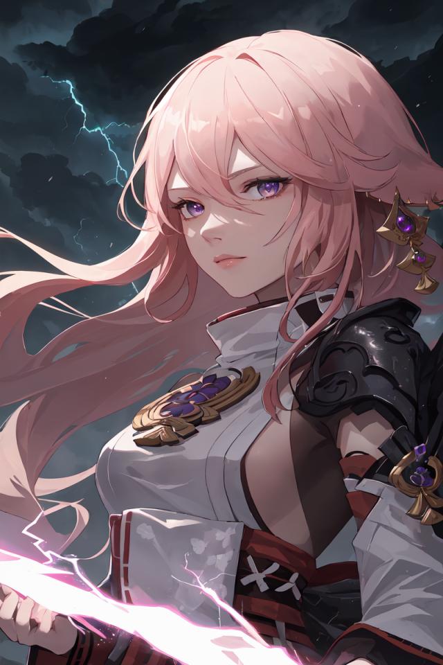 1girl, animal ears, bangs, closed mouth, cloud, cloudy sky, detached sleeves, earrings, electricity, fox ears, hair between eyes, hair ornament, japanese clothes, jewelry, lightning , long hair, long sleeves, looking at viewer, medium breasts, pink hair, purple eyes, shirt, sideboob, sky, solo, upper body, vision (genshin impact), wide sleeves