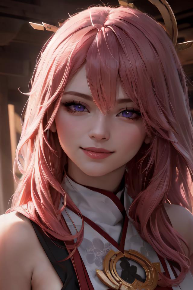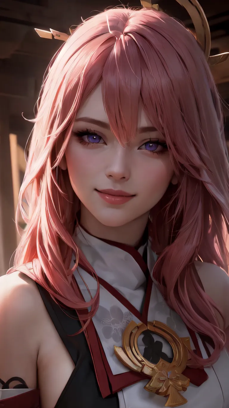 a close - up of a female avatar with pink hair and costume on holding a bow in front of the camera and a wooden pole